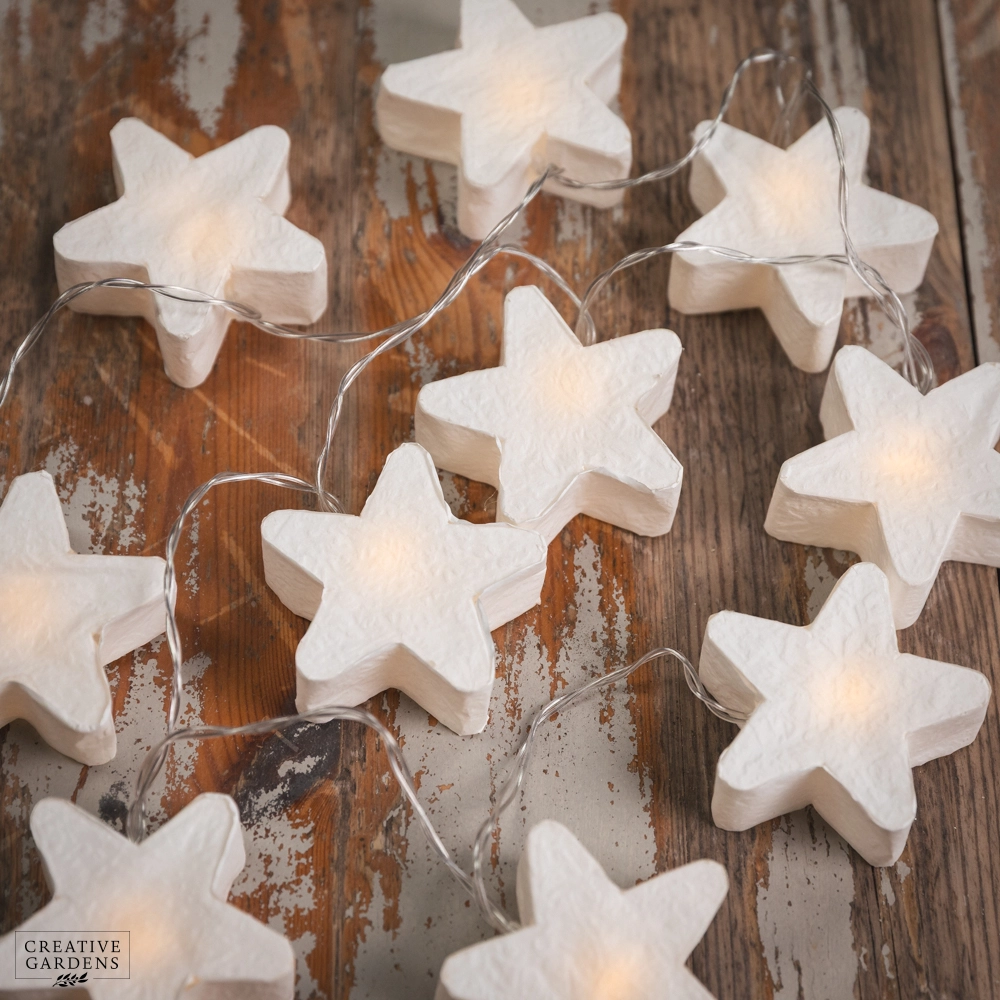 10 White Paper Stars on a clear cable with Warm White LED Lights