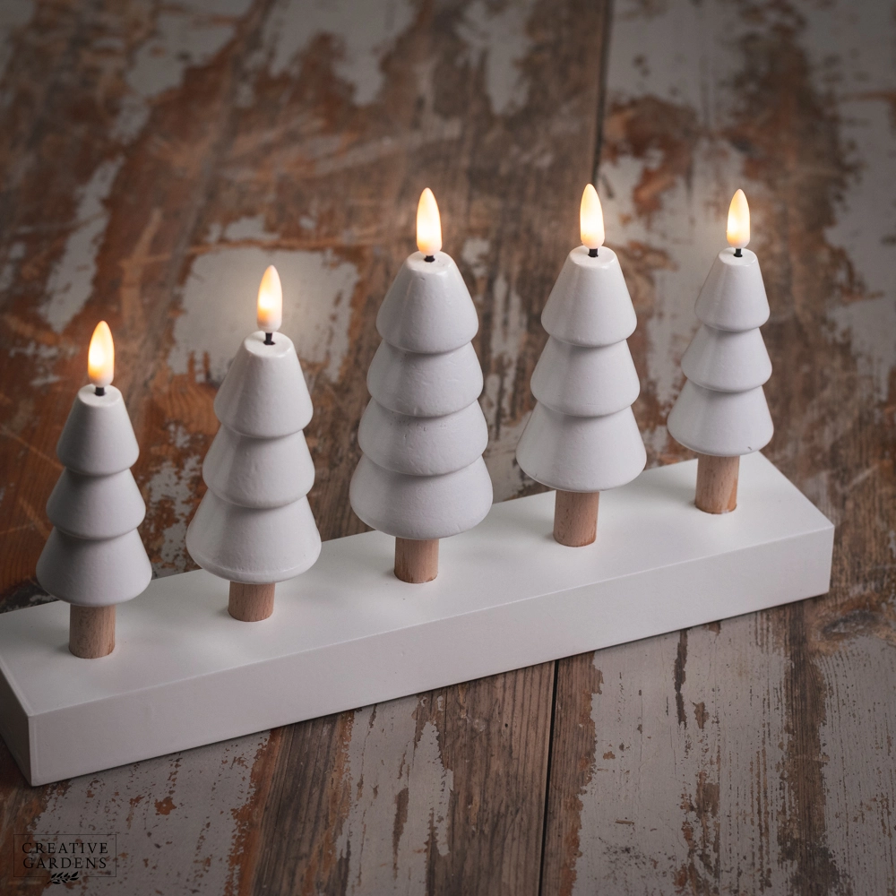 5 Wooden Christmas Tree Candles on a wooden base with 5 Warm White LED Flickering Flames