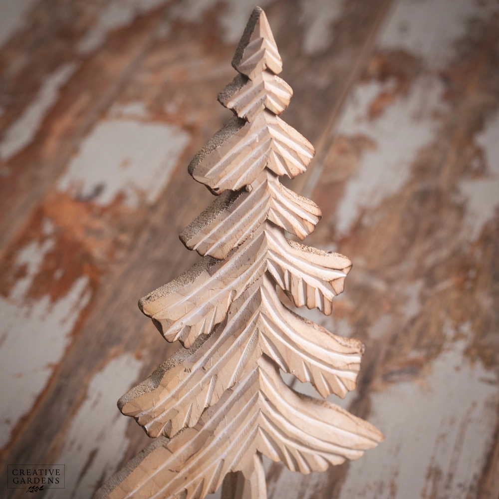 Simple yet effective, the 33Cm Wooden Natural Washed Carved Tree blends seamlessly with warm woods, deep reds, and classic creams to create a cohesive seasonal look.