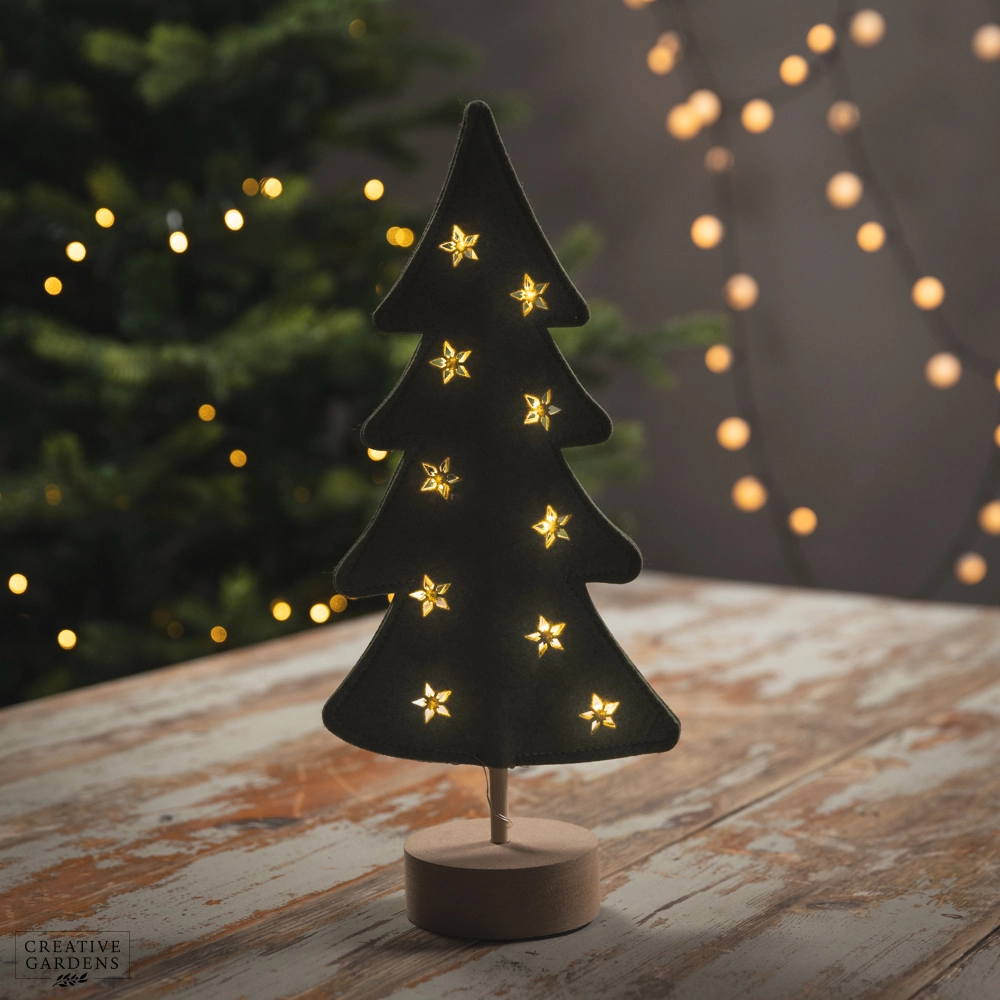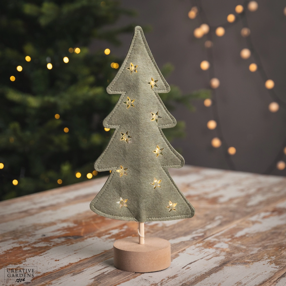 35cm Green Felt Christmas Tree on Wooden Base with Warm White LED Lights