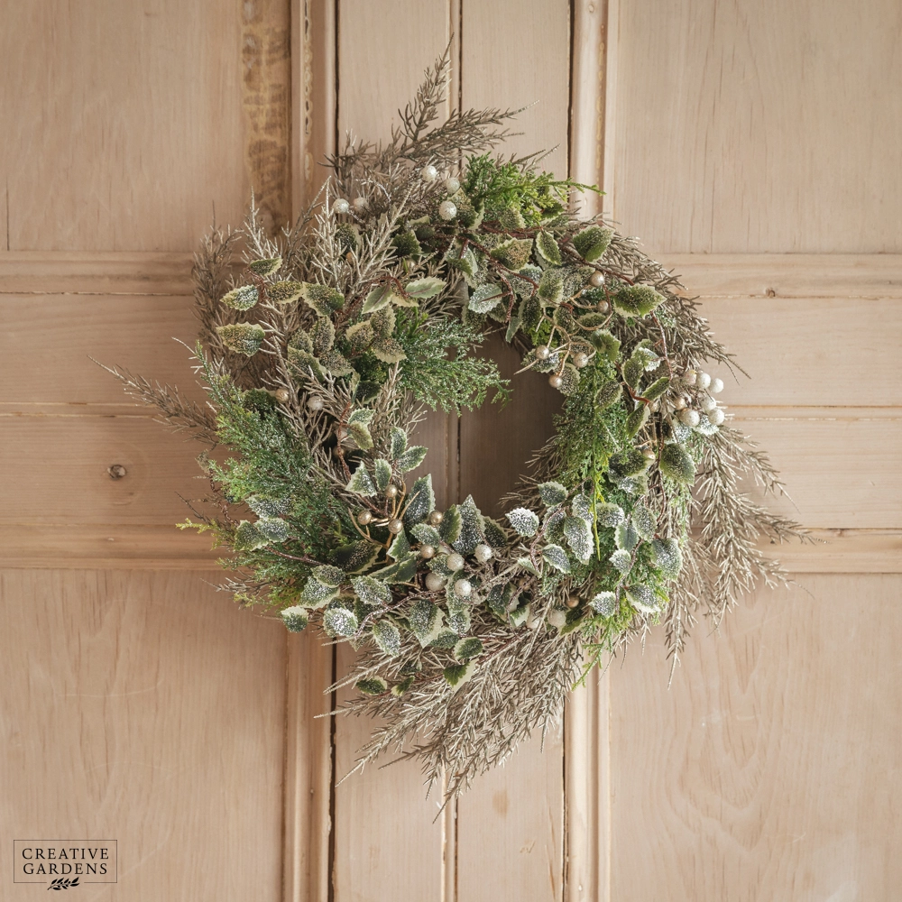 40cm Champagne wreath with silver foliage, conifer foliage, berries and holly foliage.