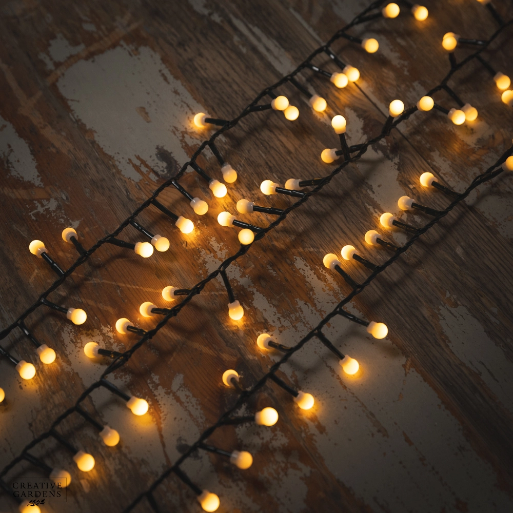 Warm White LED Berry String Lights with green cable allowing them to blend perfectly with your Christmas Tree. These lights include 8 functions including static and come with an 8 Hour Timer.