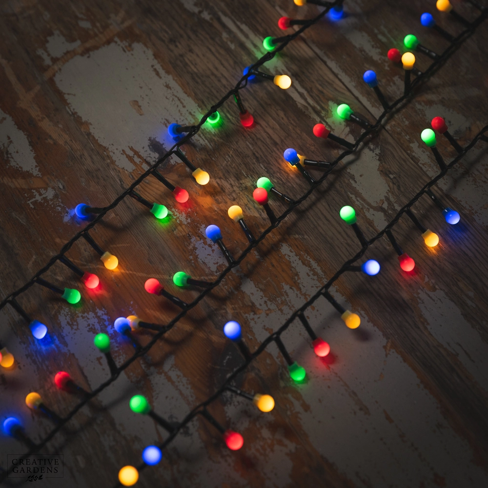 Multicoloured LED Berry String Lights with green cable allowing them to blend perfectly with your Christmas Tree. These lights include 8 functions including static and come with an 8 Hour Timer.