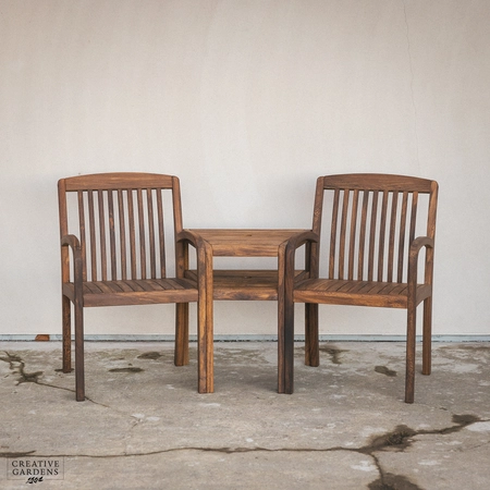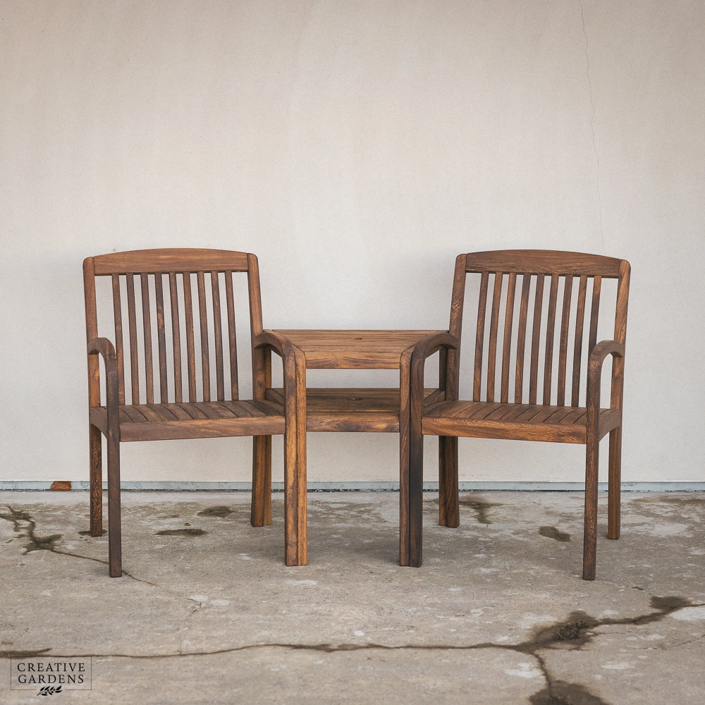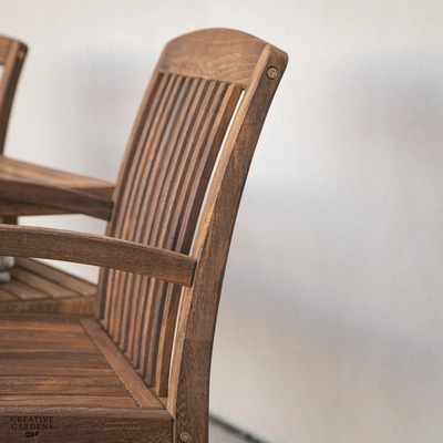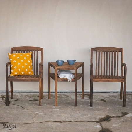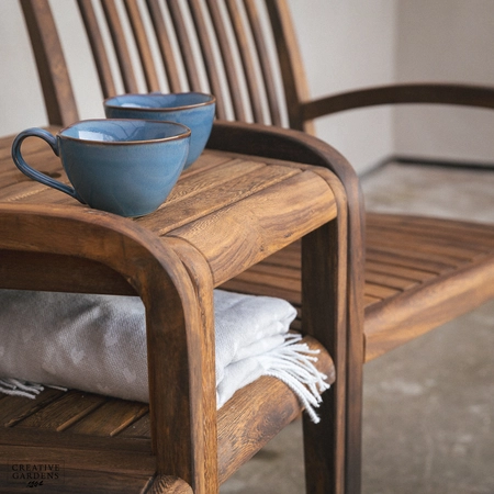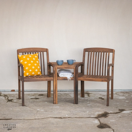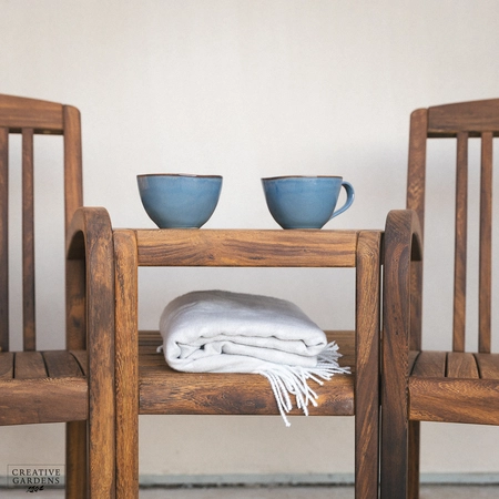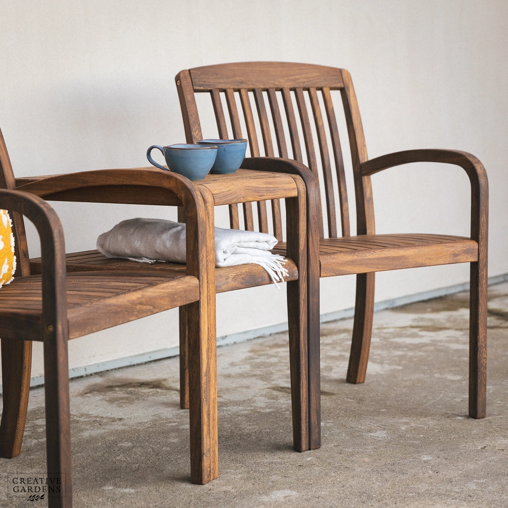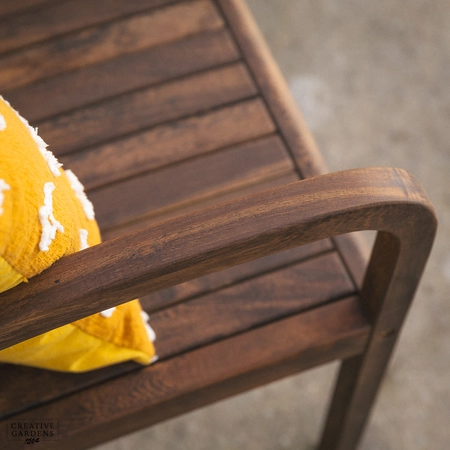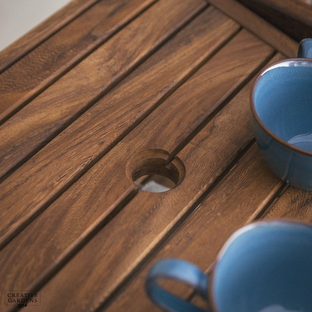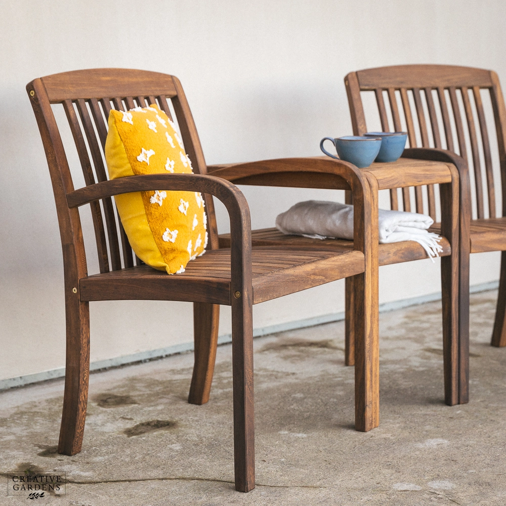 The beautiful Bolney companion set is made from strong Acacia timber. It’s a rich brown colour, complete with a smooth, sanded finish which enhances the natural figurative grain. The corners of the chairs at the top are smoothly curved with narrow and elegant slats as back support. The durability of this timber is comparable to that of teak – so you can be confident it’ll last you many years to come. Create a companion set by placing the table in between two armchairs or use as a stand alone table to complement your set. The table accommodates a parasol which can be used with our bases, to create shade on those summer days. You can use our Colour Protector to help retain the colour and Timber Shield for protection from food and drink stains, as well as water ingress.