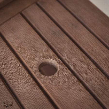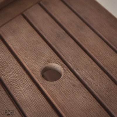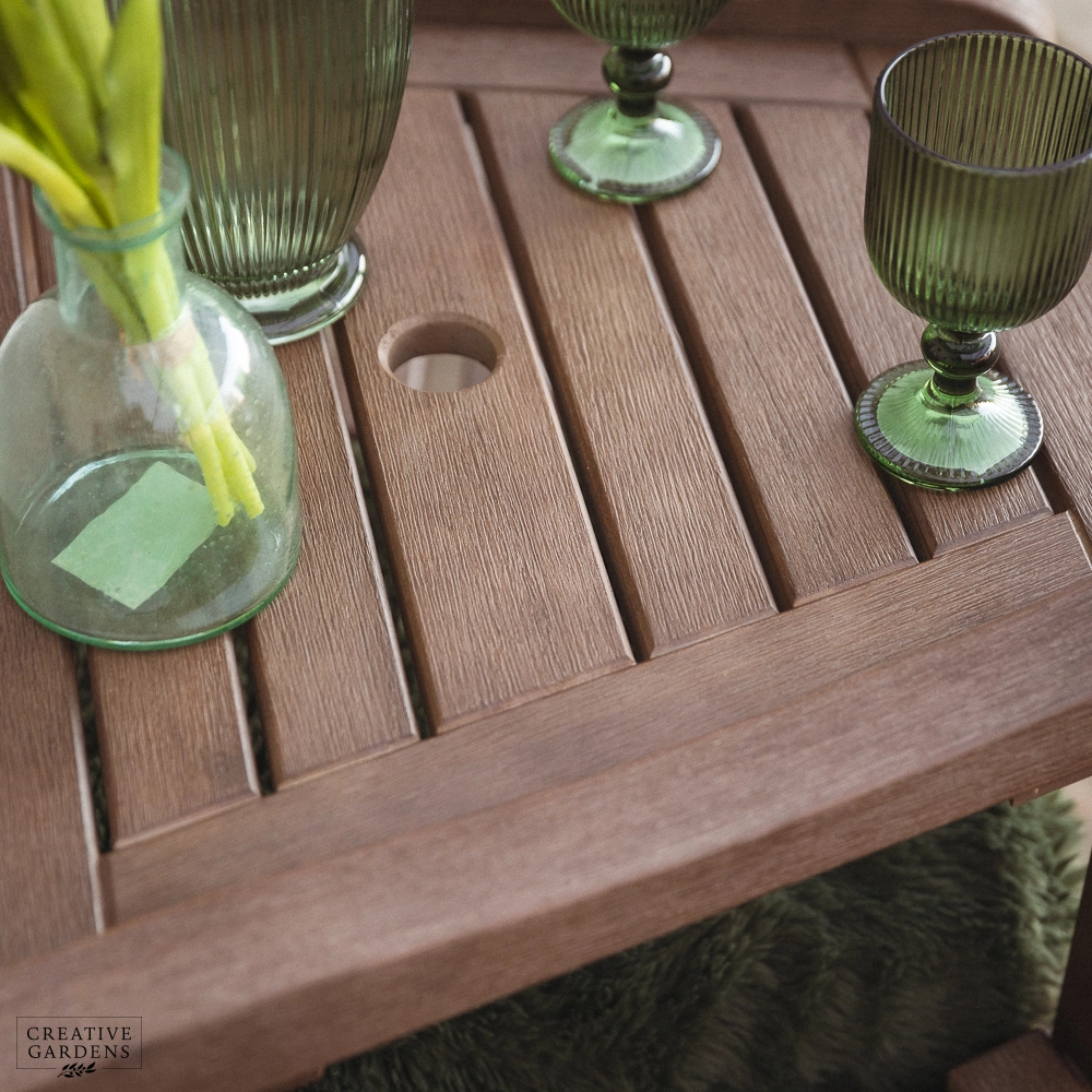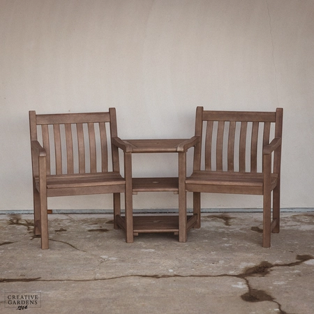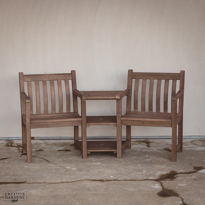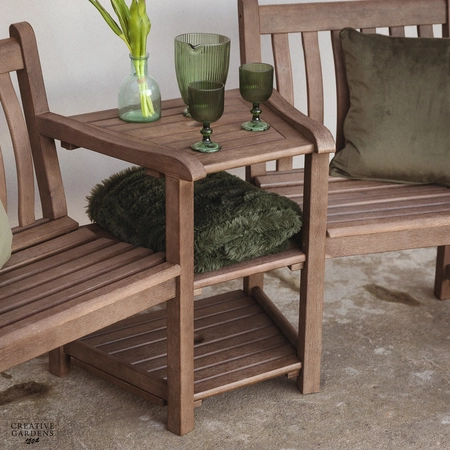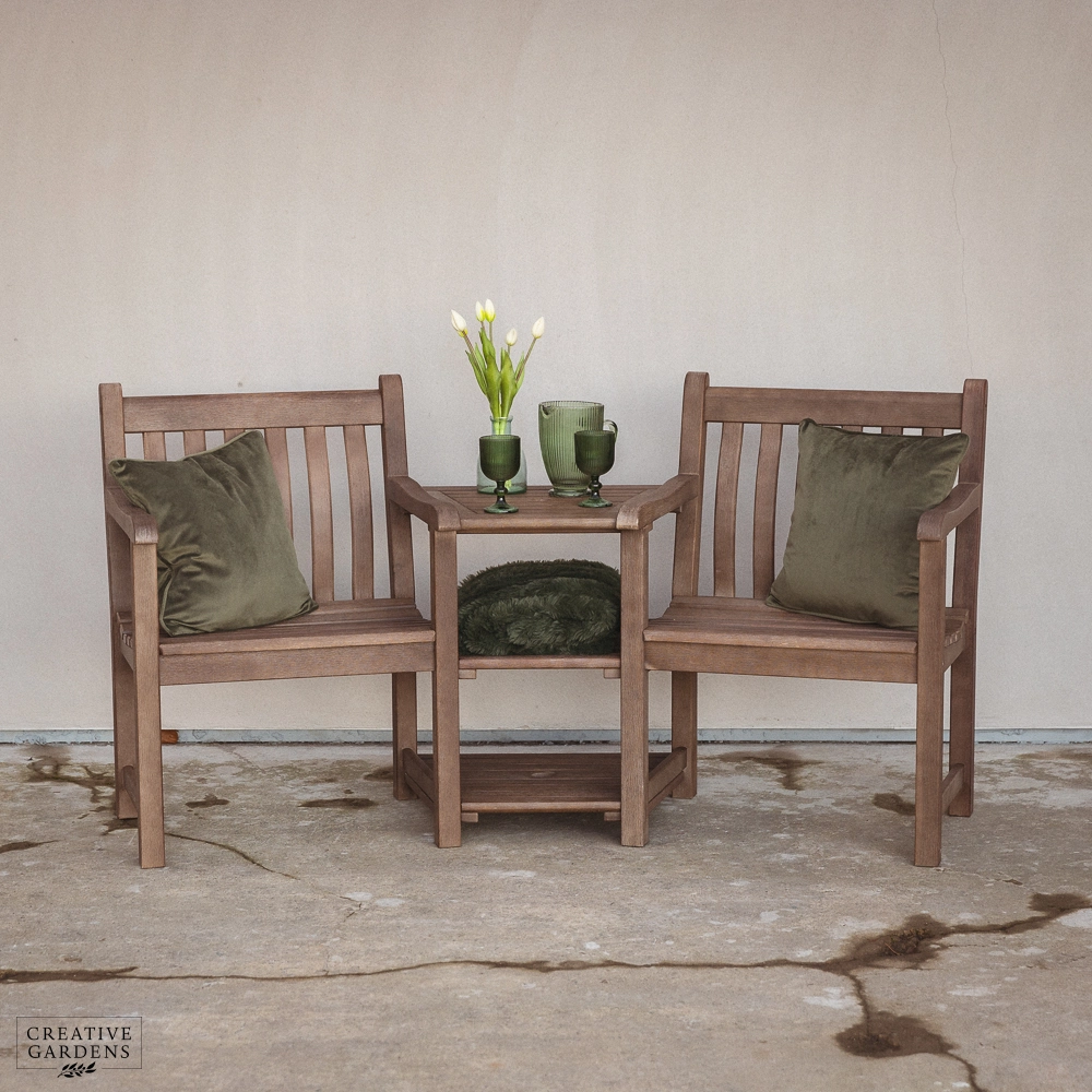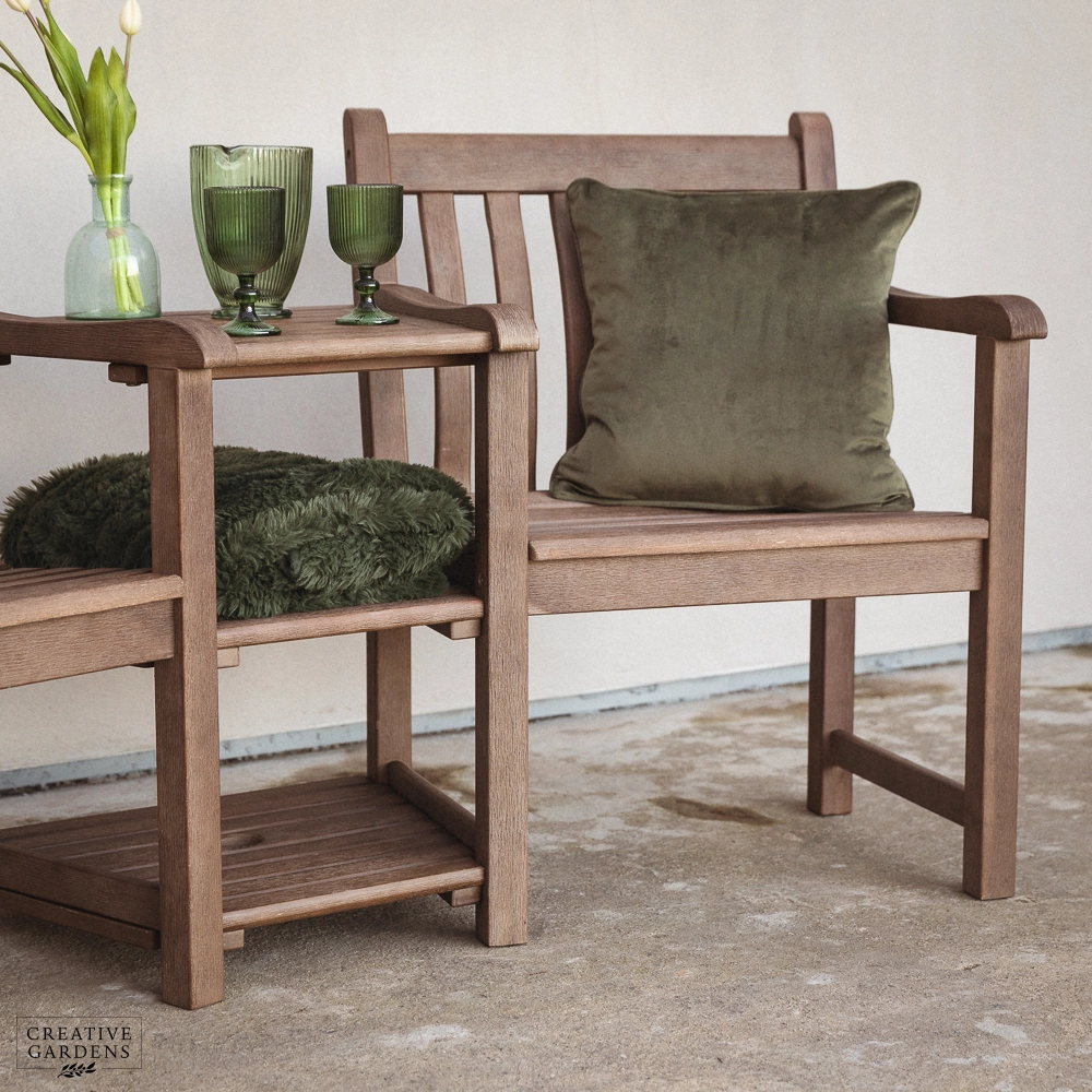 Enjoy valuable time with a friend or loved one on this charming two seater wooden companion set which is part of our much-loved Sherwood Range. This set is a grade up from your classic garden bench – it comes with an integrated table which is perfect for your cup of tea or cocktail. And beneath the table top there are a further two shelves, which are handy places to rest your book or iPad. If it’s getting a little too hot, there are holes through both the table and shelves for a parasol. The curved back will give you supreme comfort and the materials used within this range will give you the reassurance of durability and practicality. The timber is Acacia wood, sourced from Vietnam which is hard-wearing and has a beautiful and rich, chestnut-brown appearance. Like all products in this popular range, the companion set has a brushed finish, which is achieved by rubbing the painted finish with a wire brush. We love this unique, rustic finish and so do many of our customers.