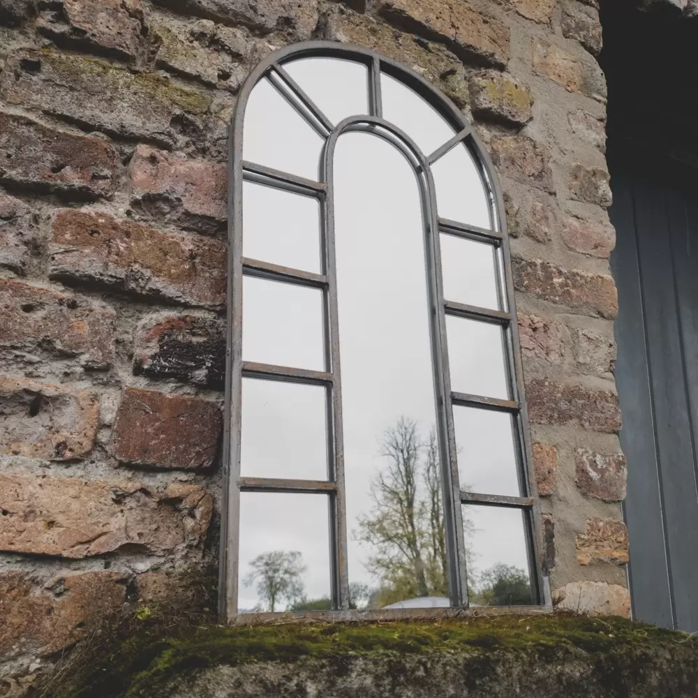 Ornate Metal Garden Mirror with rounded top and panel detail. Suitable for Outdoor Use