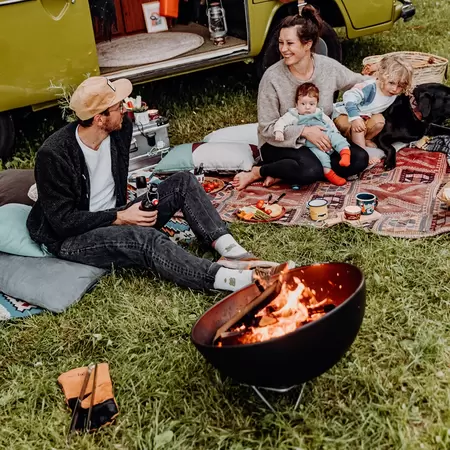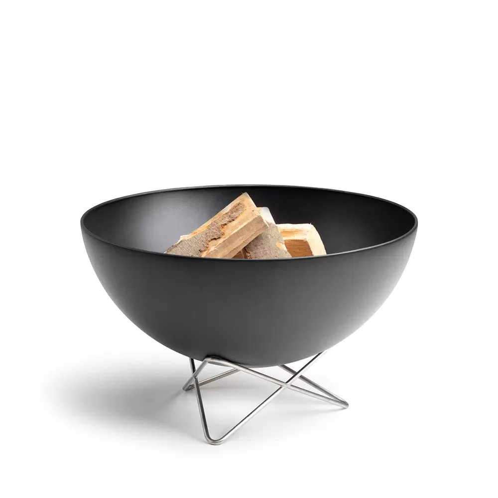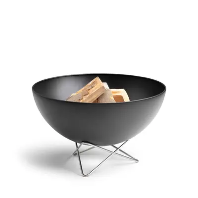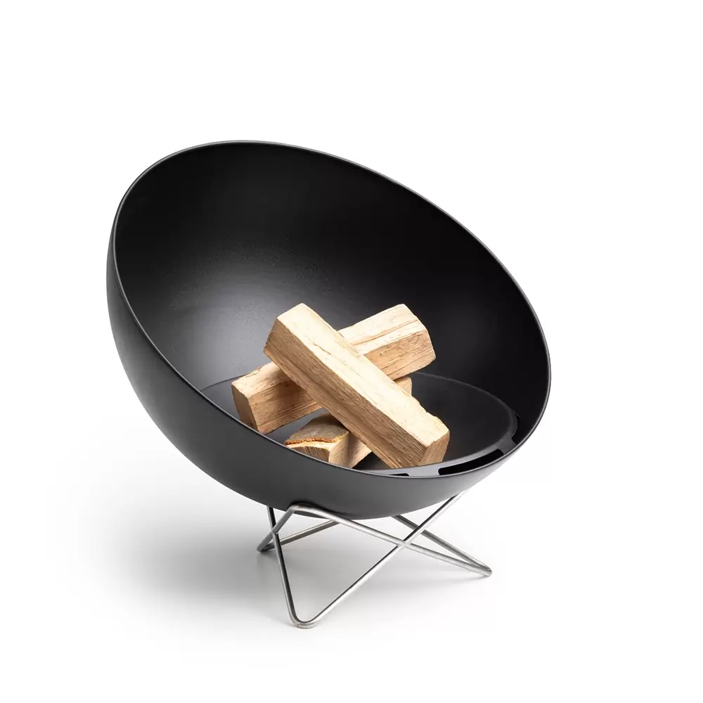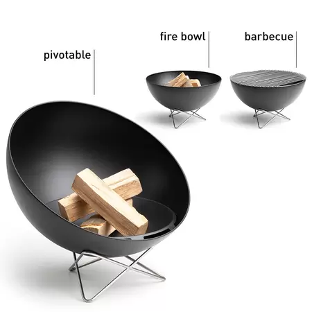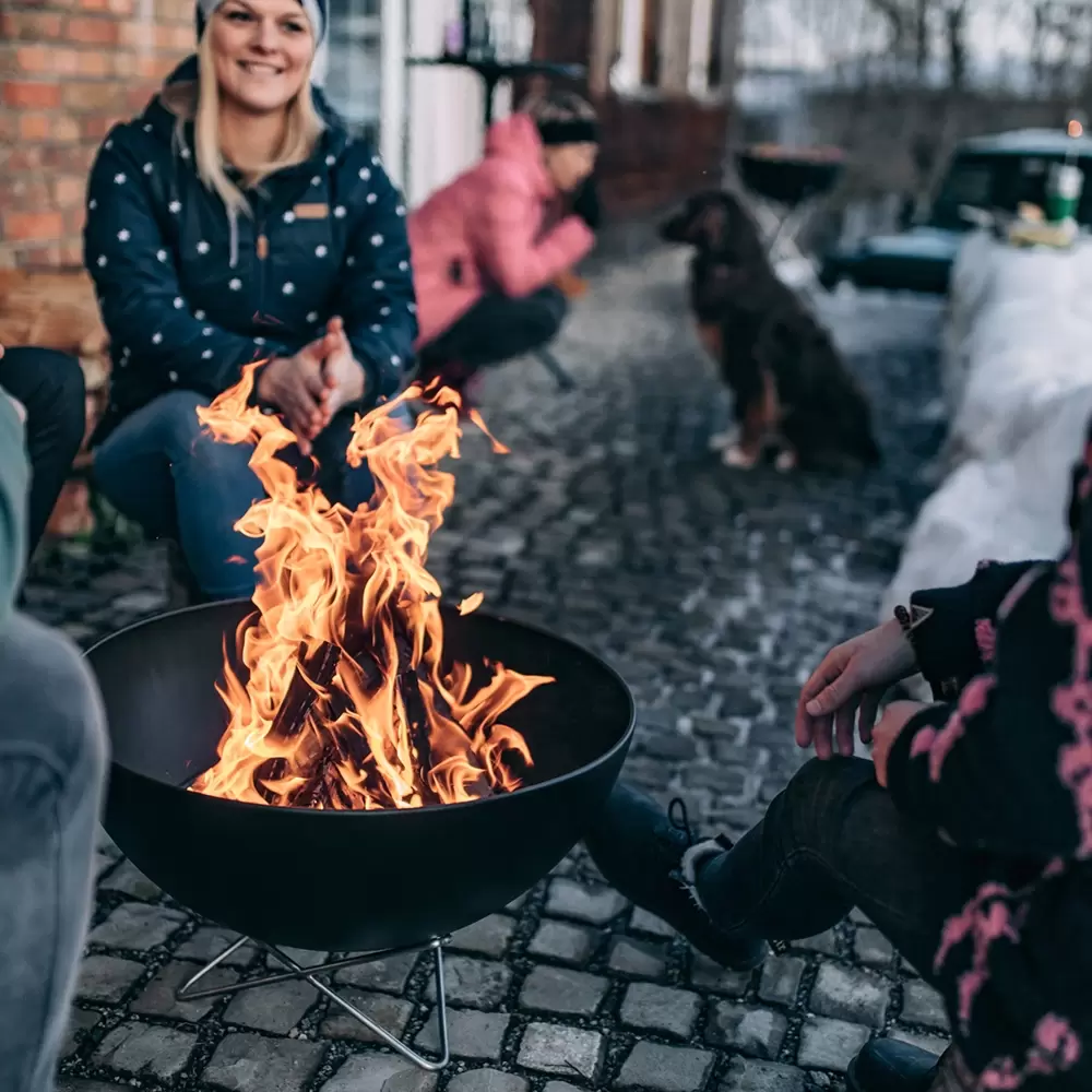 BOWL - the black hemisphere's simple and minimalist form fascinates and amazes with its unique versatility! Put the bowl horizontal for grilling, or at an angle if you want the cosy warmth of the open fire in one direction. It’s up to you! And you also have the flexibility to decide how high the fire should be. Use the wire stand to create a casual lounge atmosphere. The foldable tripod (accessory) puts BOWL at a convenient height for grilling or for standing around at parties. Bowl can be assembled and disassembled again in no time at all. Without any tools. You decide what, when and where: A spontaneous twist bread or sausage over the open fire? Juicy steaks, tender fish and delicious veg from the BBQ? Or simply chilling with a view of the flames? The hemisphere can be tilted to protect your fire from the wind and to radiate the warmth in a specific direction. And the next morning? You simply remove the ash bowl, it’s so easy to clean.