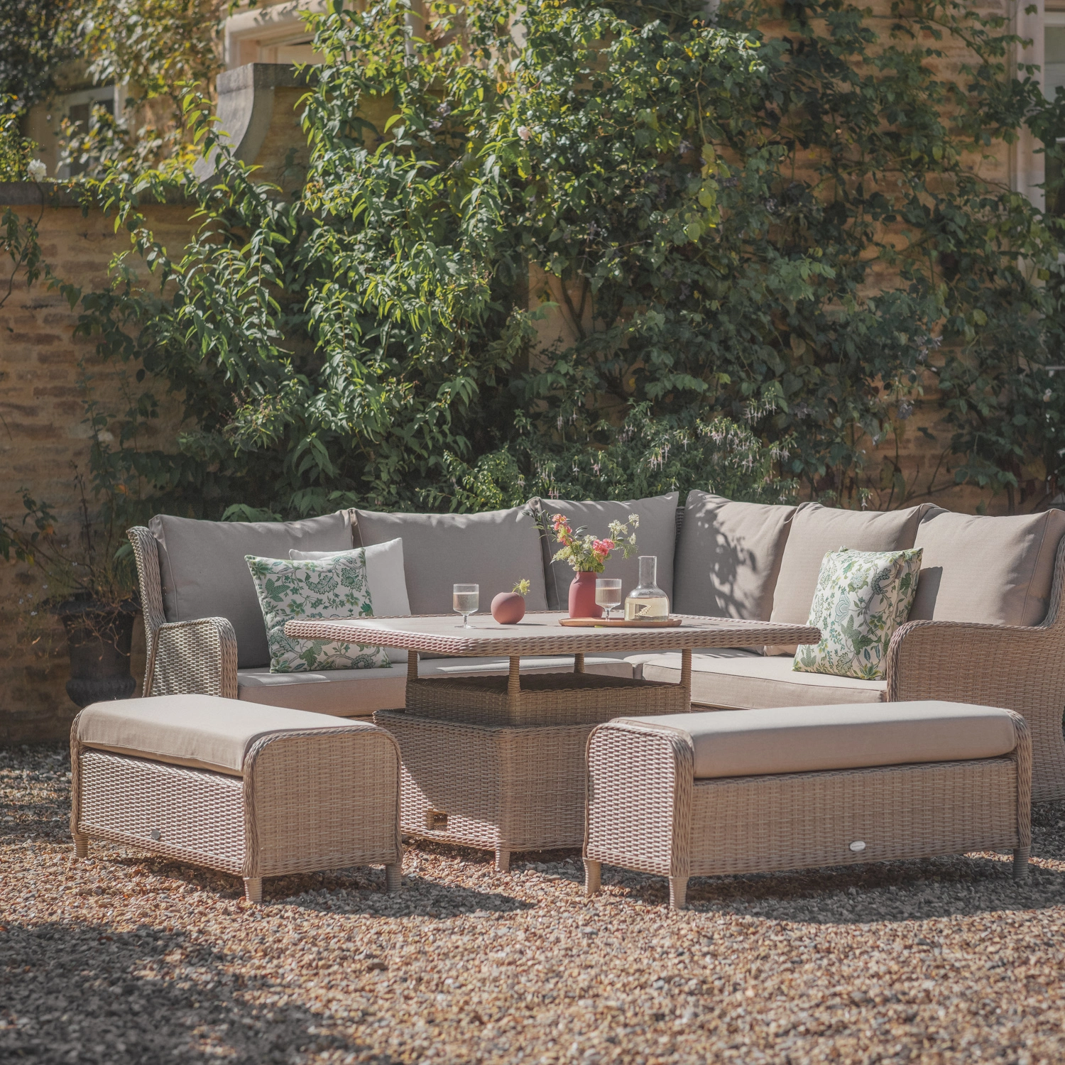 With its pleasing blend of traditional rattan design, our Chedworth range boasts classic good looks combined with the benefit of modern materials. Meal time or me time? This reclining corner sofa set ticks both boxes; enjoy a lazy lunch and simply recline the sofa to indulge in a sneaky afternoon snooze. With its clever height-changing table, you can switch from low level morning coffee mode to dining height in an instant. Two smart padded benches add to the versatility of this stylish set.