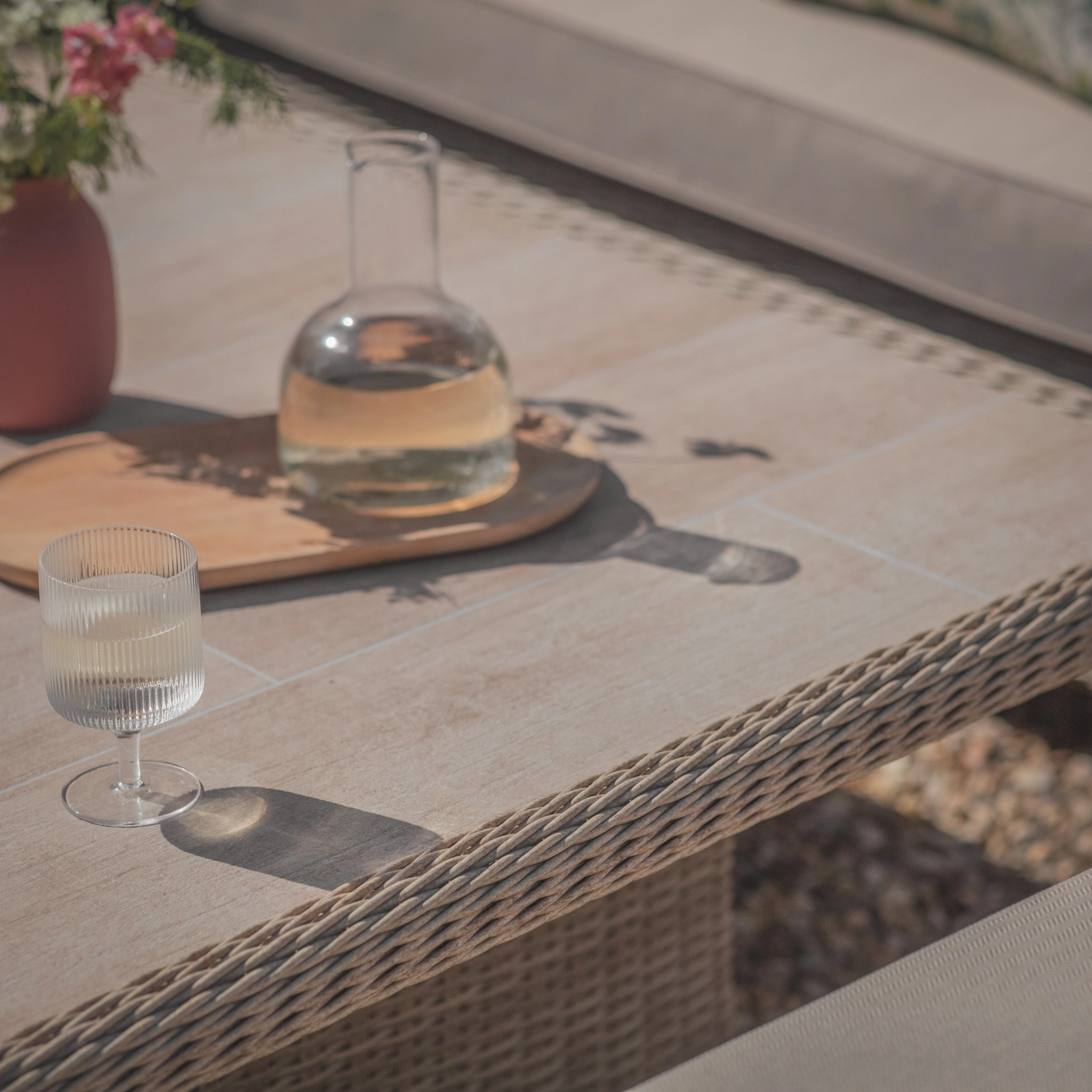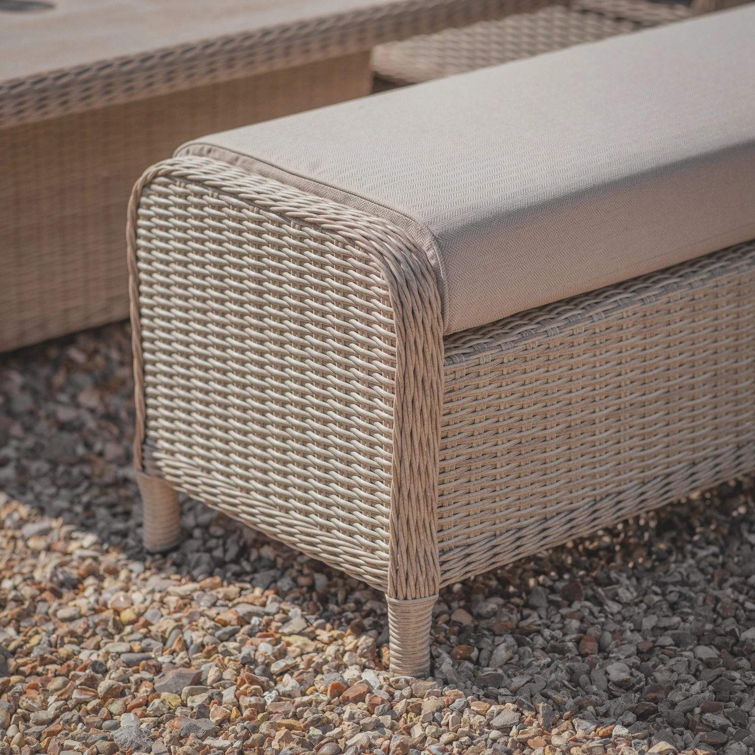 The all-weather Sandstone rattan is built on an aluminium frame, hence the furniture is lightweight and easy to move. Blissfully comfortable, soft-touch Herringbone Barley cushions are made from season-proof fabric which is water, UV and stain resistant.