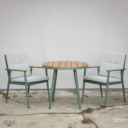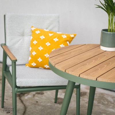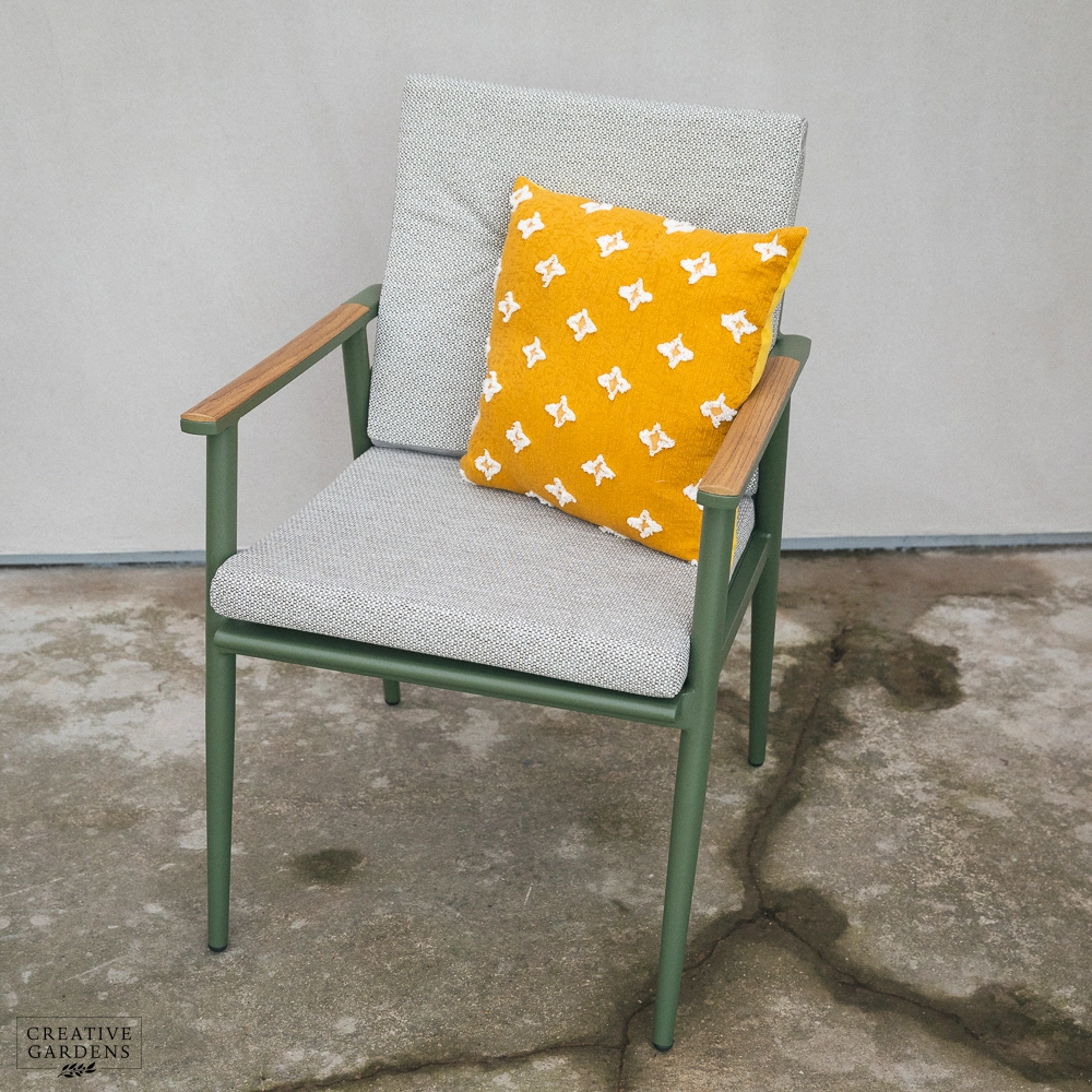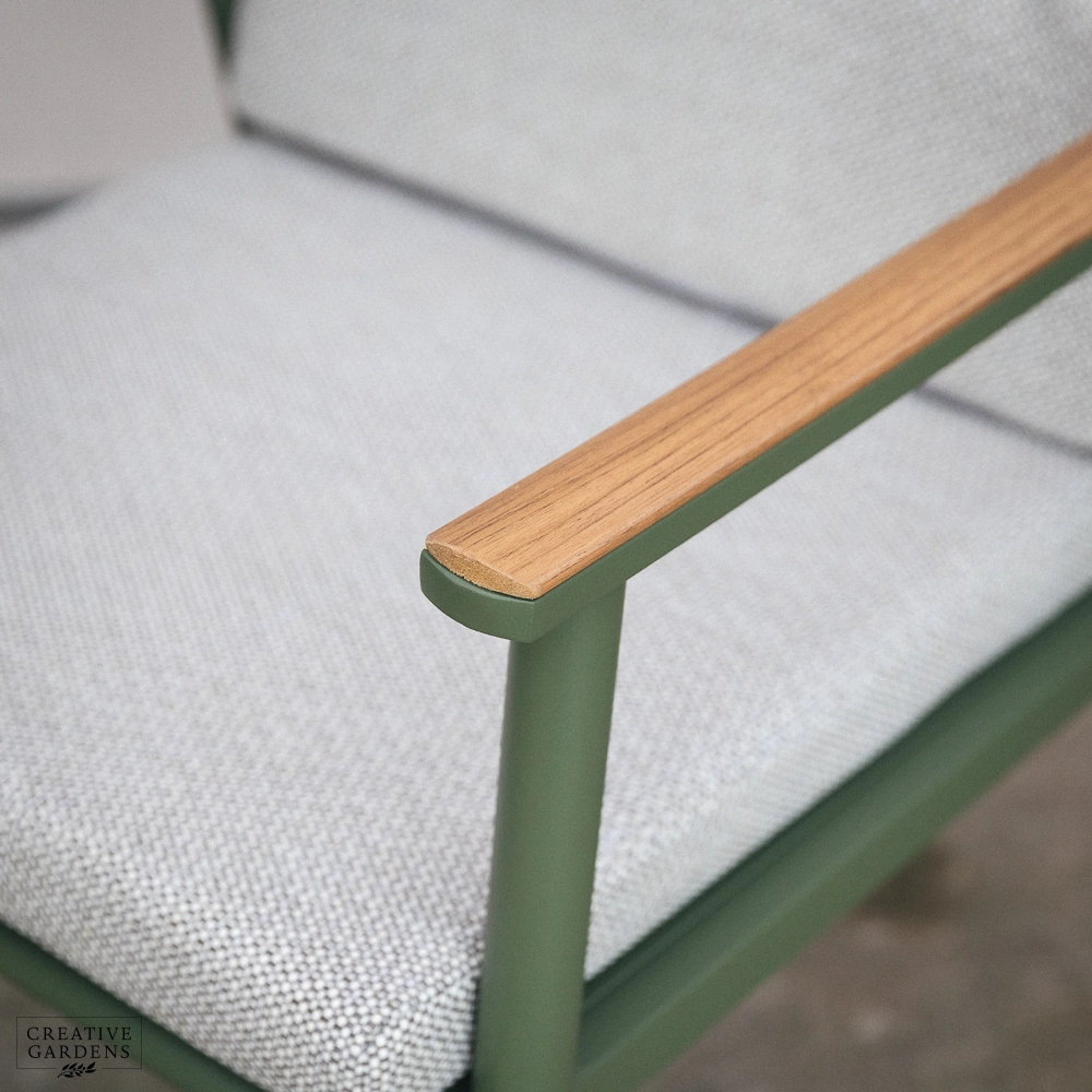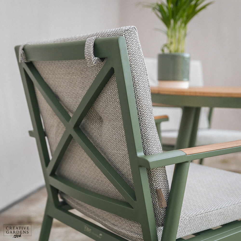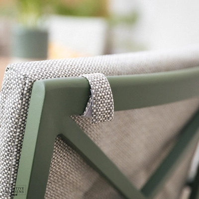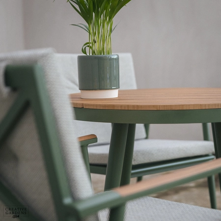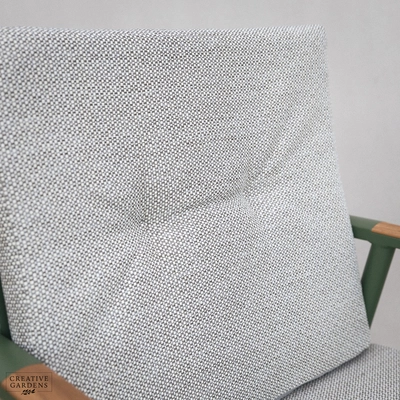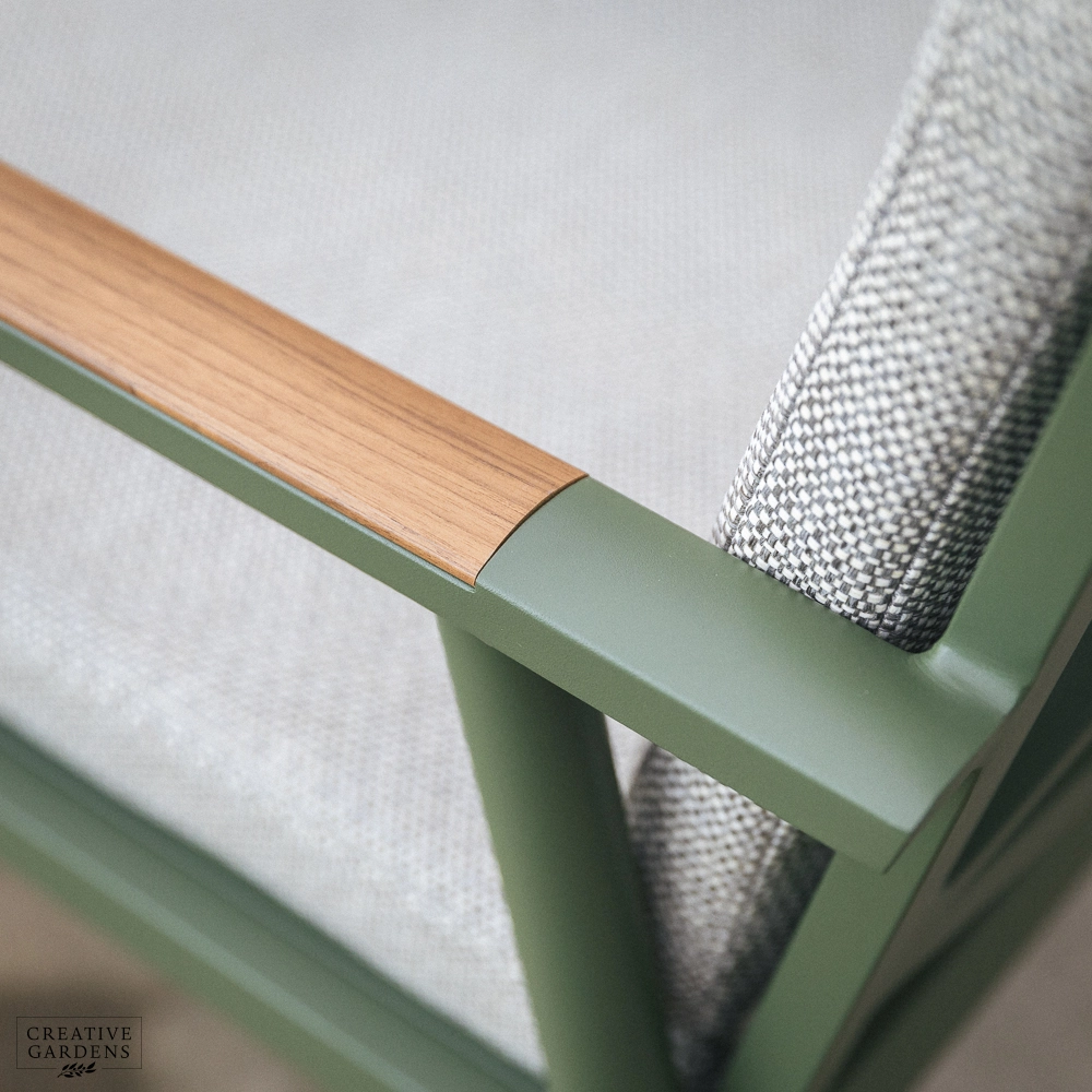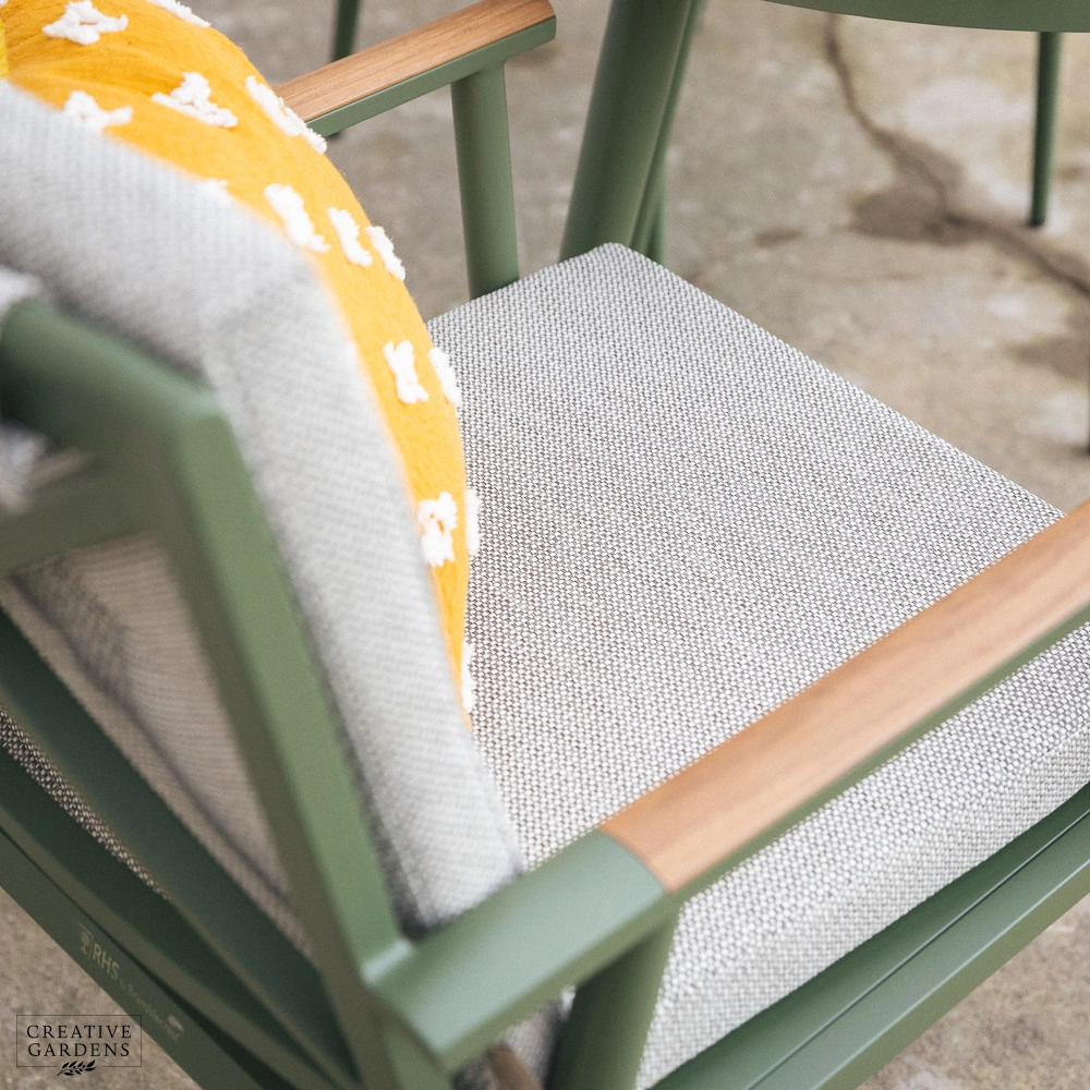 The RHS Wisley collection, crafted in a soft sage tone, seamlessly complements natural surroundings. With its criss-cross seat back design and minimalist profile, paired with Mist-coloured fabric, it’s the perfect option for those seeking a more understated style.