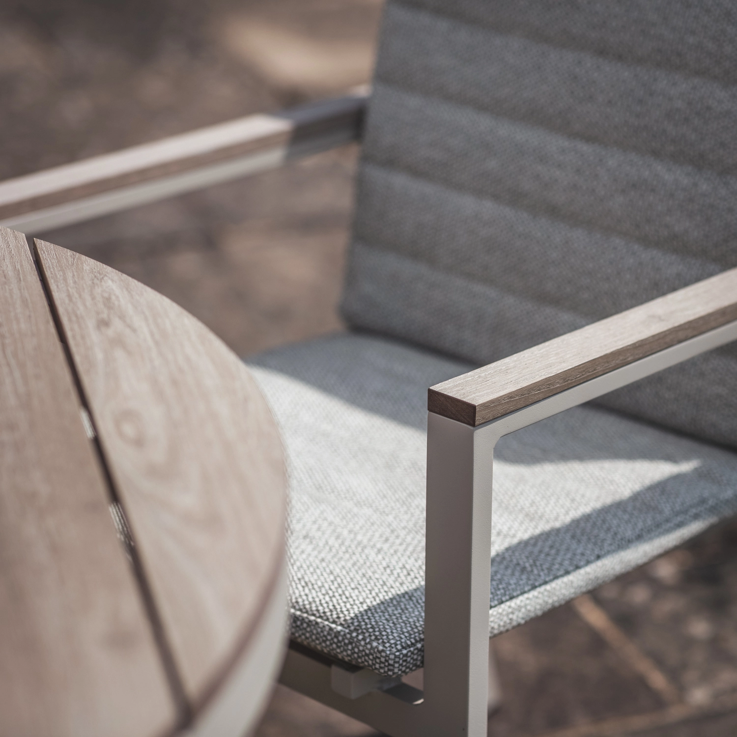 - Season-proof, UV-resistant Eco cushions in Mist, made with fabric using recycled plastic bottles