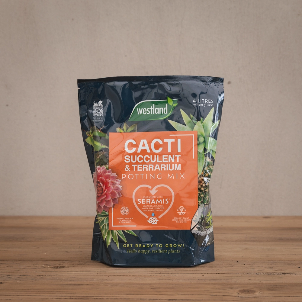 Westland Cacti & Succulent Potting Mix is a peat free blend containing just the right level of nutrients your cacti and succulents need to thrive. It is enriched with sand, creating a high free draining gritty mix for dry, healthy roots. The added zinc complex promotes more root growth into your new potting mix, faster re-potting establishment, and also boosts plant resilience. The Seramis® granules absorb all the water and nutrients and then release them when the plant needs them. This ensures the plants are kept hydrated and nourished.