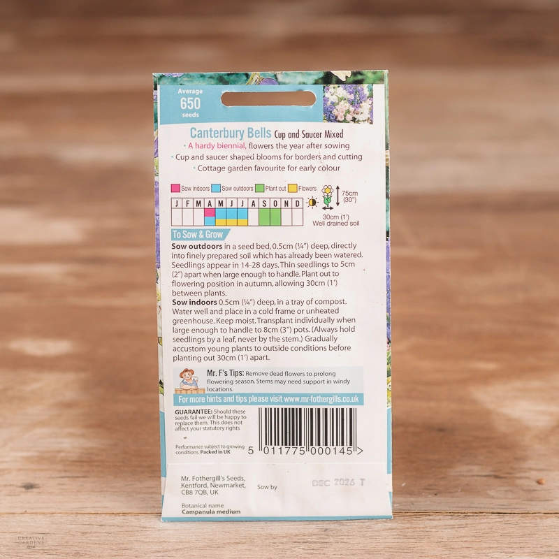 Are you looking for the product "Canterbury Bells Cup & Saucer Mix"? We offer Fothergills Seeds products in our garden centers in Donaghadee, Bushmills, Galgorm and Logwood. You can also order the product "Canterbury Bells Cup & Saucer Mix" online for £ 2.49 or check the products in Seeds & Bulbs. We look forward to seeing you soon!