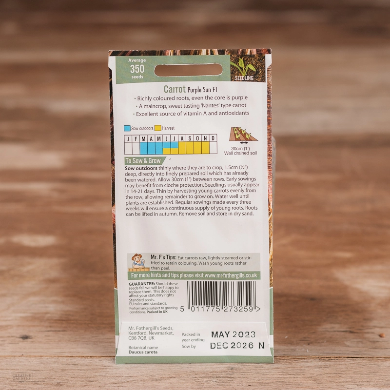 Are you looking for the product "Carrot Purple Sun F1"? We offer Fothergills Seeds products in our garden centers in Donaghadee, Bushmills, Galgorm and Logwood. You can also order the product "Carrot Purple Sun F1" online for £ 3.99 or check the products in Seeds & Bulbs. We look forward to seeing you soon!
