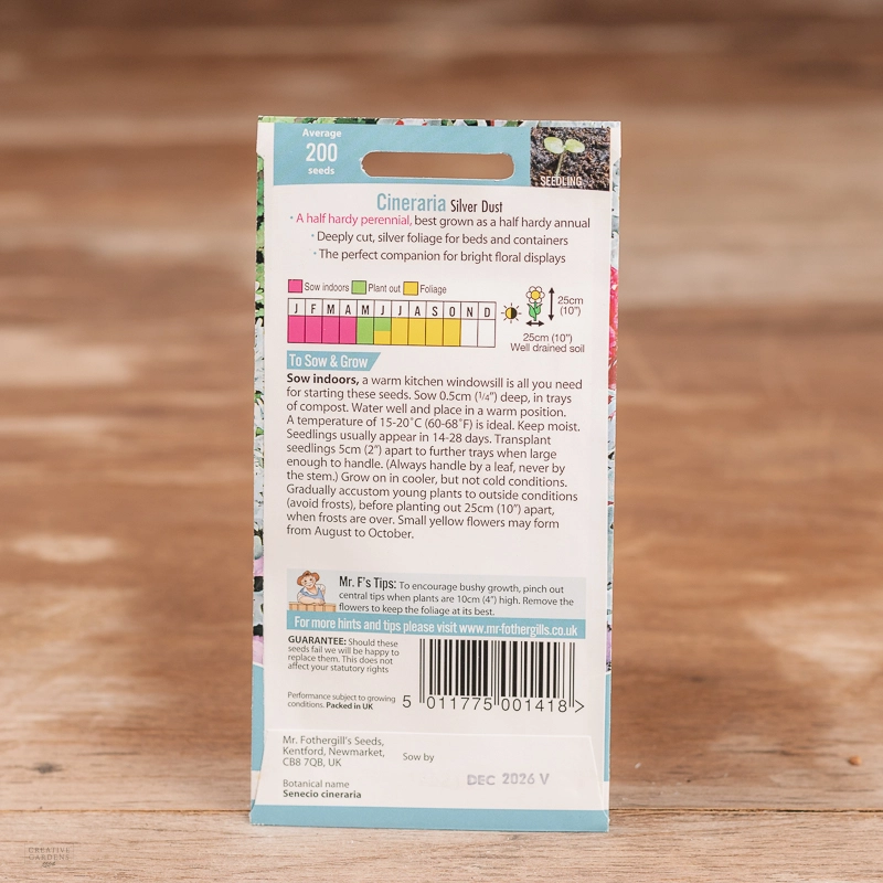 Are you looking for the product "Cineraria Silver Dust"? We offer Fothergills Seeds products in our garden centers in Donaghadee, Bushmills, Galgorm and Logwood. You can also order the product "Cineraria Silver Dust" online for £ 2.49 or check the products in Seeds & Bulbs. We look forward to seeing you soon!