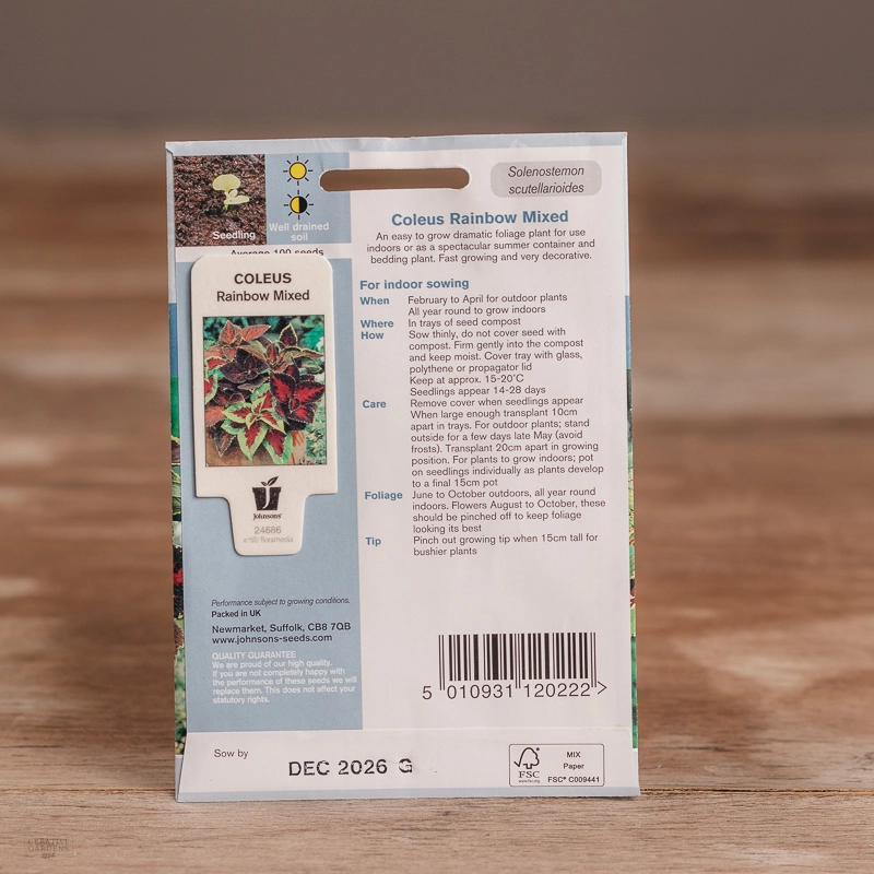 Are you looking for the product "Coleus Rainbow Mix"? We offer Johnsons Seeds products in our garden centers in Donaghadee, Bushmills, Galgorm and Logwood. You can also order the product "Coleus Rainbow Mix" online for £ 3.19 or check the products in Seeds & Bulbs. We look forward to seeing you soon!