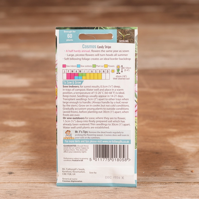 Are you looking for the product "Cosmos Candy Stripe"? We offer Fothergills Seeds products in our garden centers in Donaghadee, Bushmills, Galgorm and Logwood. You can also order the product "Cosmos Candy Stripe" online for £ 3.19 or check the products in Seeds & Bulbs. We look forward to seeing you soon!