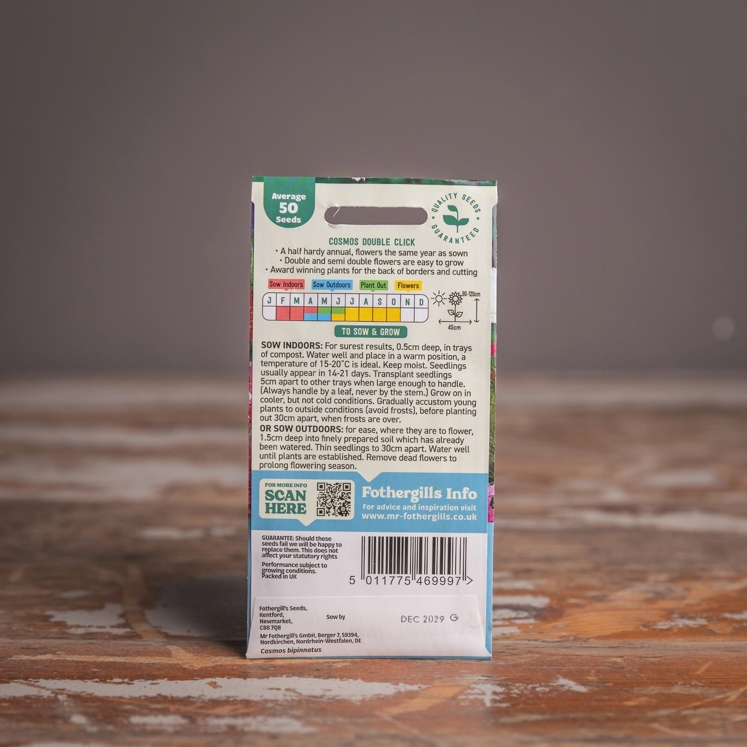 Are you looking for the product "Cosmos Double Click"? We offer Fothergills Seeds products in our garden centers in Donaghadee, Bushmills, Galgorm and Logwood. You can also order the product "Cosmos Double Click" online for £ 3.49 or check the products in Seeds & Bulbs. We look forward to seeing you soon!