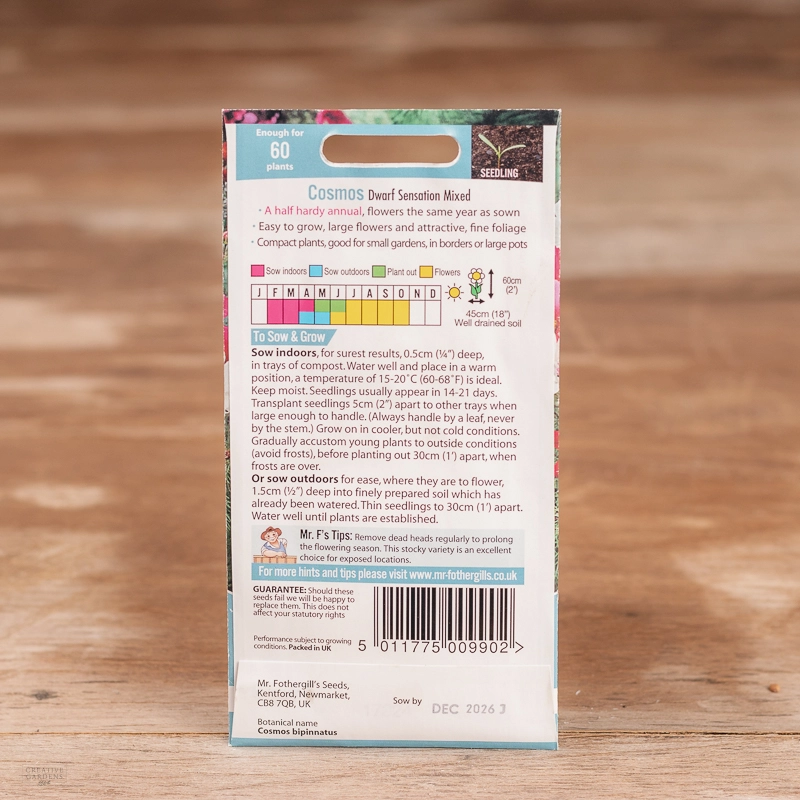 Are you looking for the product "Cosmos Dwarf Sensation Mix"? We offer Fothergills Seeds products in our garden centers in Donaghadee, Bushmills, Galgorm and Logwood. You can also order the product "Cosmos Dwarf Sensation Mix" online for £ 3.19 or check the products in Seeds & Bulbs. We look forward to seeing you soon!