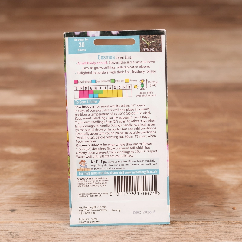 Are you looking for the product "Cosmos Sweet Kisses"? We offer Fothergills Seeds products in our garden centers in Donaghadee, Bushmills, Galgorm and Logwood. You can also order the product "Cosmos Sweet Kisses" online for £ 3.19 or check the products in Seeds & Bulbs. We look forward to seeing you soon!