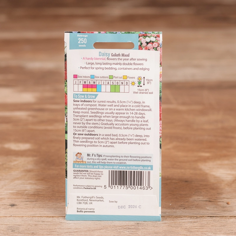 Are you looking for the product "Daisy Goliath Mix"? We offer Fothergills Seeds products in our garden centers in Donaghadee, Bushmills, Galgorm and Logwood. You can also order the product "Daisy Goliath Mix" online for £ 3.19 or check the products in Seeds & Bulbs. We look forward to seeing you soon!