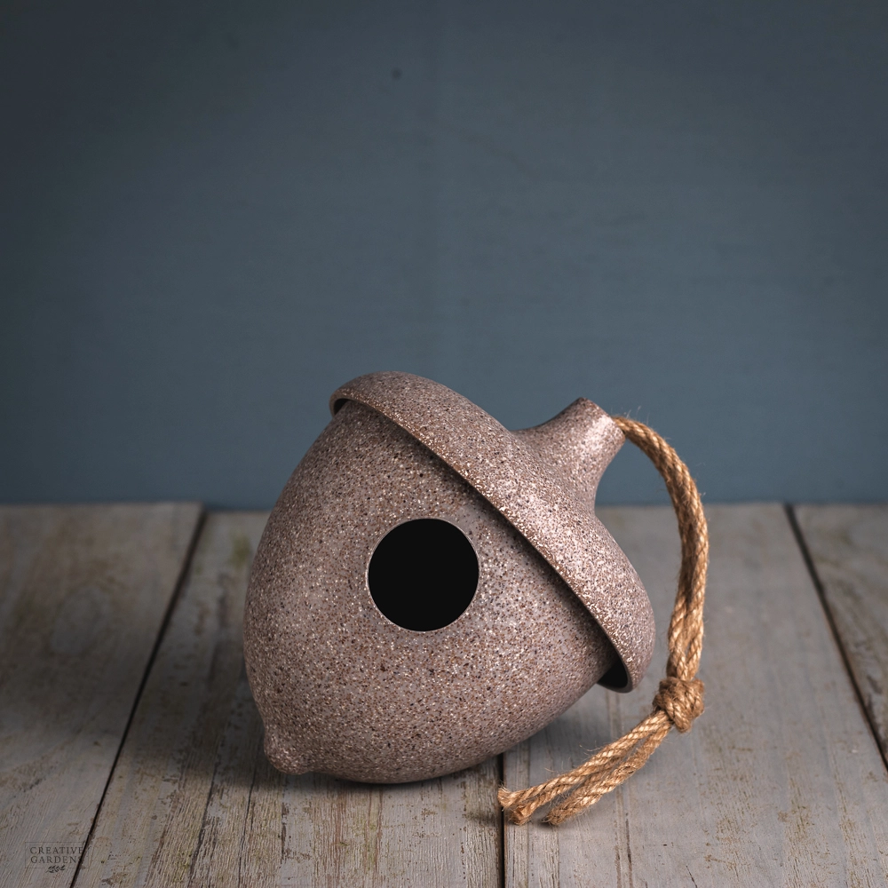 An acorn shaped bird house hung from jute twine made from recycled wasted and blended with resin, in a woodland colour. This product would look stylish in the garden whilst providing a home for the birds. Size 18.7 x 16.4 cm