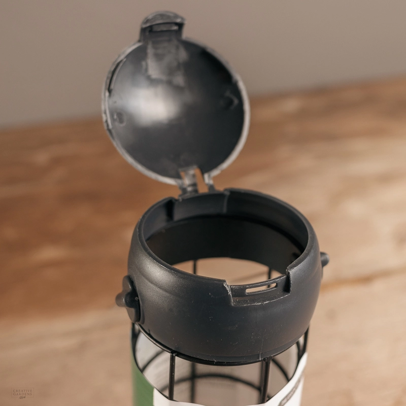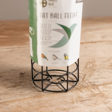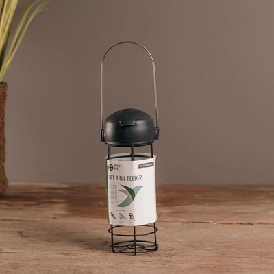 A sleek contemporary feeder in grey featuring an easy opening lid with covered wire for safe refilling. This feeder holds approximately 3 of our 80g fat balls. The product label colours match the fat balls range to support easier shopability to identify the right feed to put in your feeder.