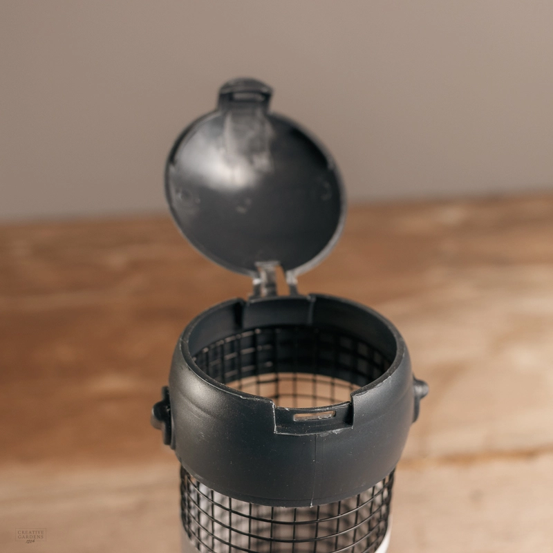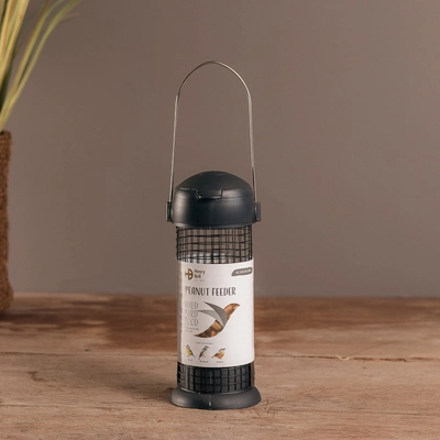 A sleek, contemporary, robust feeder in grey featuring an easy opening lid and a removable base for easy cleaning. This feeder holds approximately 250g of peanuts. The product label colours match the peanuts range to support easier shopability to identify the right feed to put in your feeder.