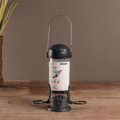 A sleek, contemporary, robust feeder in grey featuring easy opening lid and removable base for easy cleaning. This feeder holds approximately 250g of our seed mix. The design incorporates bird friendly perches to enable birds to comfortably feed and an angled base to ensure the seed flows to the feeding ports. The product label colours match the superior seed mix range to support easier shopability to identify the right feed to put in your feeder.