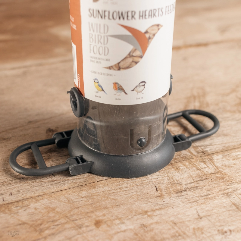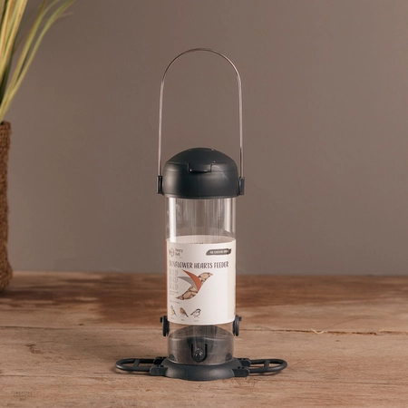 A sleek, contemporary, robust feeder in grey featuring an easy opening lid and a removable base for easy cleaning. The design incorporates a bird friendly perches to enable birds to comfortably feed and an angled base to ensure the sunflower hearts flow to the feeding ports. This feeder holds approximately 220g of our sunflower hearts. The product label colours match the sunflower hearts range to support easier shopability to identify the right feed to put in your feeder.