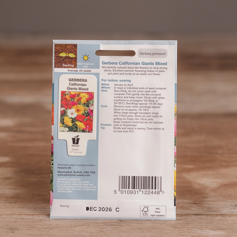 Are you looking for the product "Gerbera Californian Giants Mix"? We offer Johnsons Seeds products in our garden centers in Donaghadee, Bushmills, Galgorm and Logwood. You can also order the product "Gerbera Californian Giants Mix" online for £ 4.49 or check the products in Seeds & Bulbs. We look forward to seeing you soon!