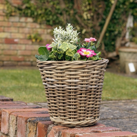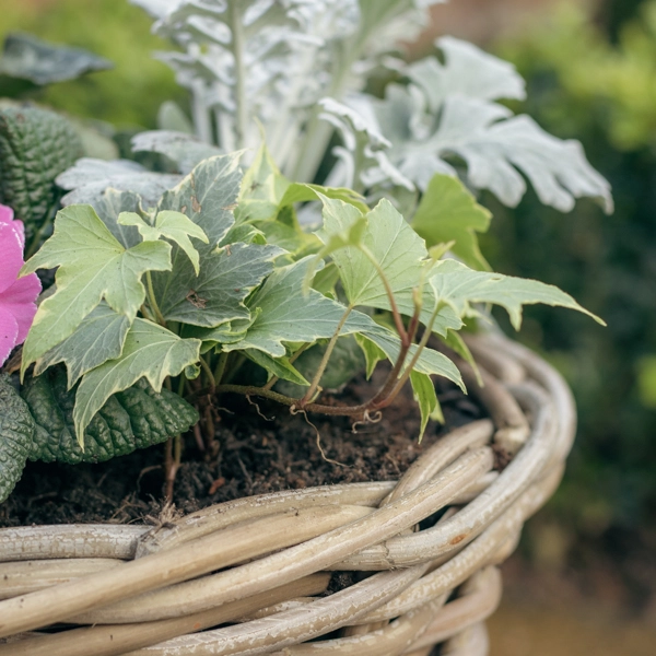 Medium Round Grey Willow Planter with a selection of Bedding Plants & Foliage.