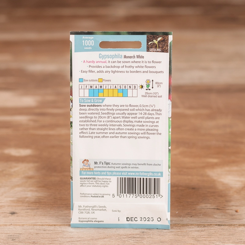 Are you looking for the product "Gypsophila Monarch White"? We offer Fothergills Seeds products in our garden centers in Donaghadee, Bushmills, Galgorm and Logwood. You can also order the product "Gypsophila Monarch White" online for £ 1.99 or check the products in Seeds & Bulbs. We look forward to seeing you soon!