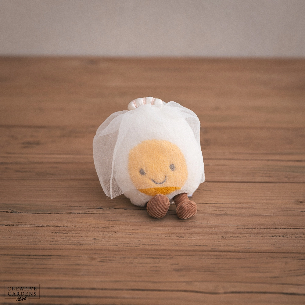 Amuseables Boiled Egg Bride can't wait to walk down the aisle! With super-soft fur in cream and yellow, and a delicate veil secured with a pearl satin tiara, this egg is perfect to have and to hold!