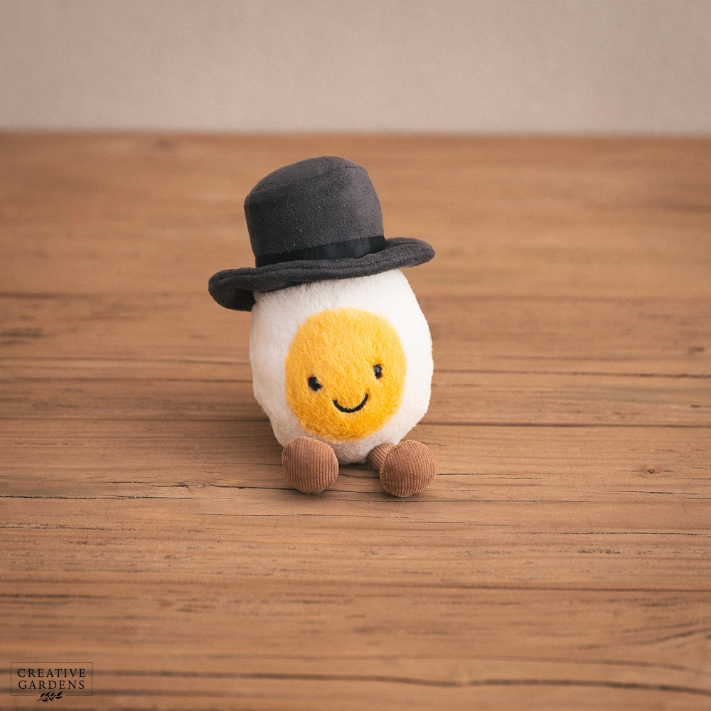 Amuseables Boiled Egg Groom can't wait to say, ‘I do’! With super-soft fur in cream and yellow, and a suedette top hat with black satin band, this egg is skipping down the aisle on cocoa cordy legs!
