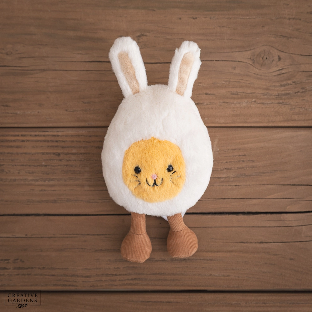 Amuseables Bunny Egg is all dressed up for the Easter hunt! Soft and sweet in cream and yellow fur, this boiled egg bunny has long cream ears with beige insides, and embroidered whiskers and nose. This perfect pal has fine cord legs to run around to find Easter eggs.
