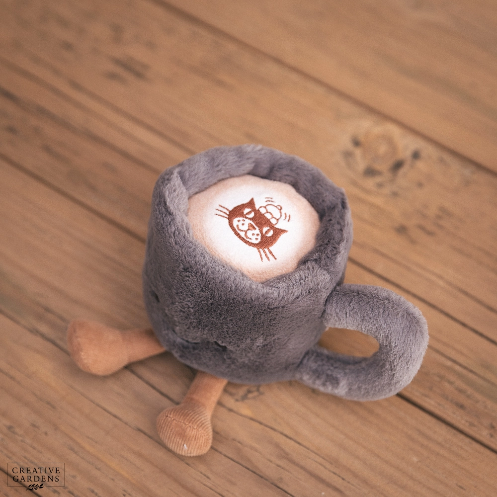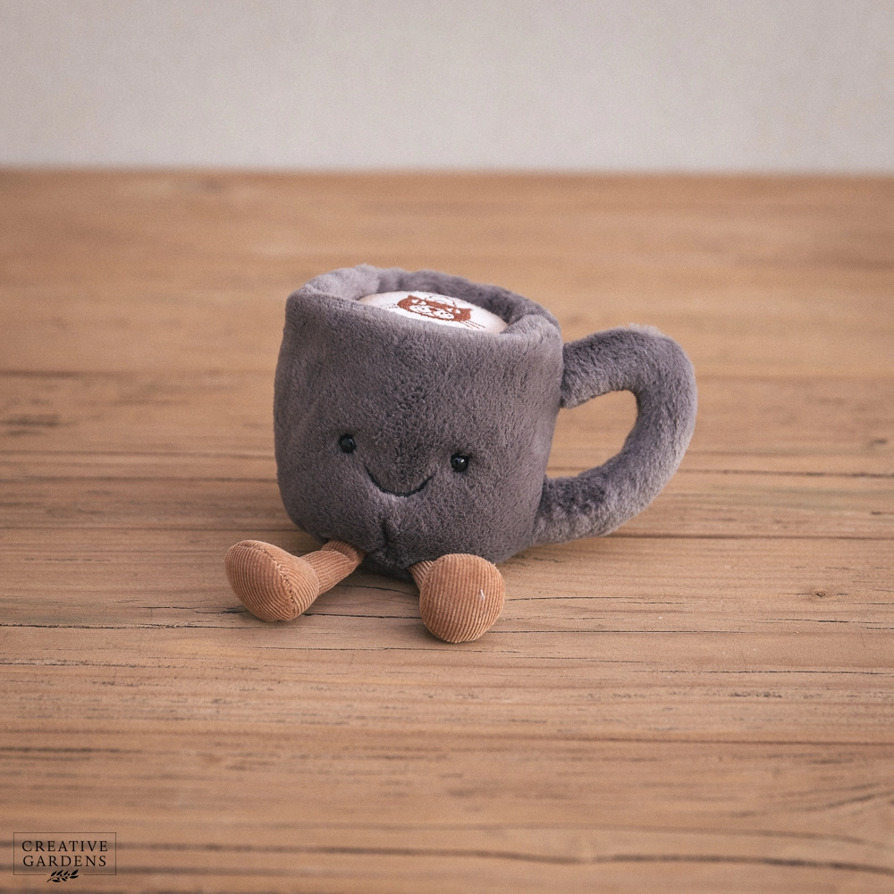 Amuseables Coffee Cup is a classic blend of rich textures and delicious colours, with notes of quirky charm! This charcoal cup perks up any desk, filled with a suedette ombre latte. With corduroy boots, a cheery smile and a Jellycat stencil embroidered on top, this cup is full of beans!