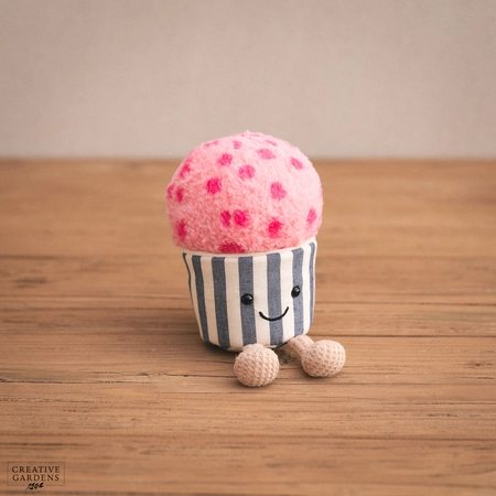 Say Ciao to Amuseables Gelato! A textured scoop of strawberry pink gelato sits in a blue and cream striped cotton cup. With waffle boots and a big, stitched smile, this sweet treat is molto bene!