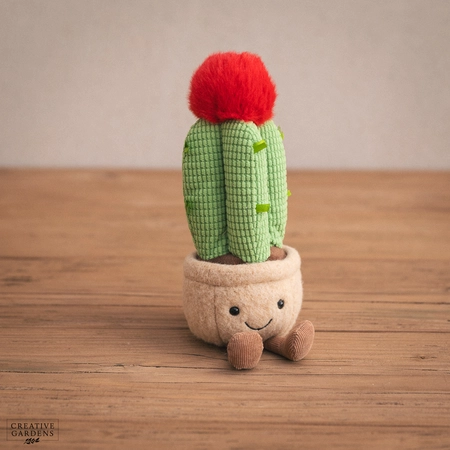 Looking pretty funky with a fluffy red crown and green grid-pattern stem, it’s Amuseables Moon Cactus! This dandy plant has an oaty felt pot, chocolate cord boots and fuzzy cocoa soil. Even the spikes are really soft ribbons!