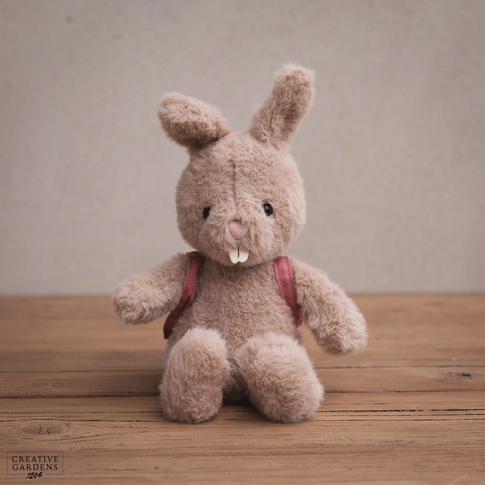 Backpack Bunny is off on a hike, hopping along over grassy green hills! Our bold little bunny has oatmeal fur and a blush-pink backpack with stripey lining! With soft buck teeth, a tubby tummy and adorably perky ears, this bun's a supercute guide!