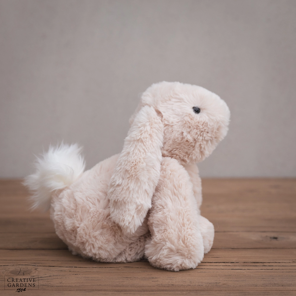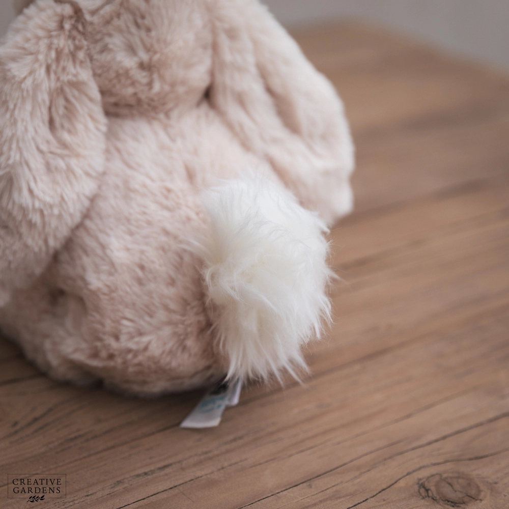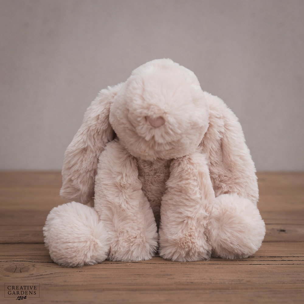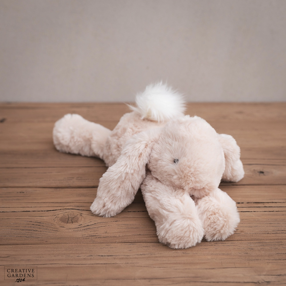 Smudge Rabbit is such a sleepy sweetie - always sprawling out, lazing on the bed or rug! Scrumptiously soft in oatmeal fur, this lop-eared lazer just captures the heart. An incredibly lopsy and loving companion, Smudge is a great gift for any bouncing baby. Bonnets and bobtails - we like it!