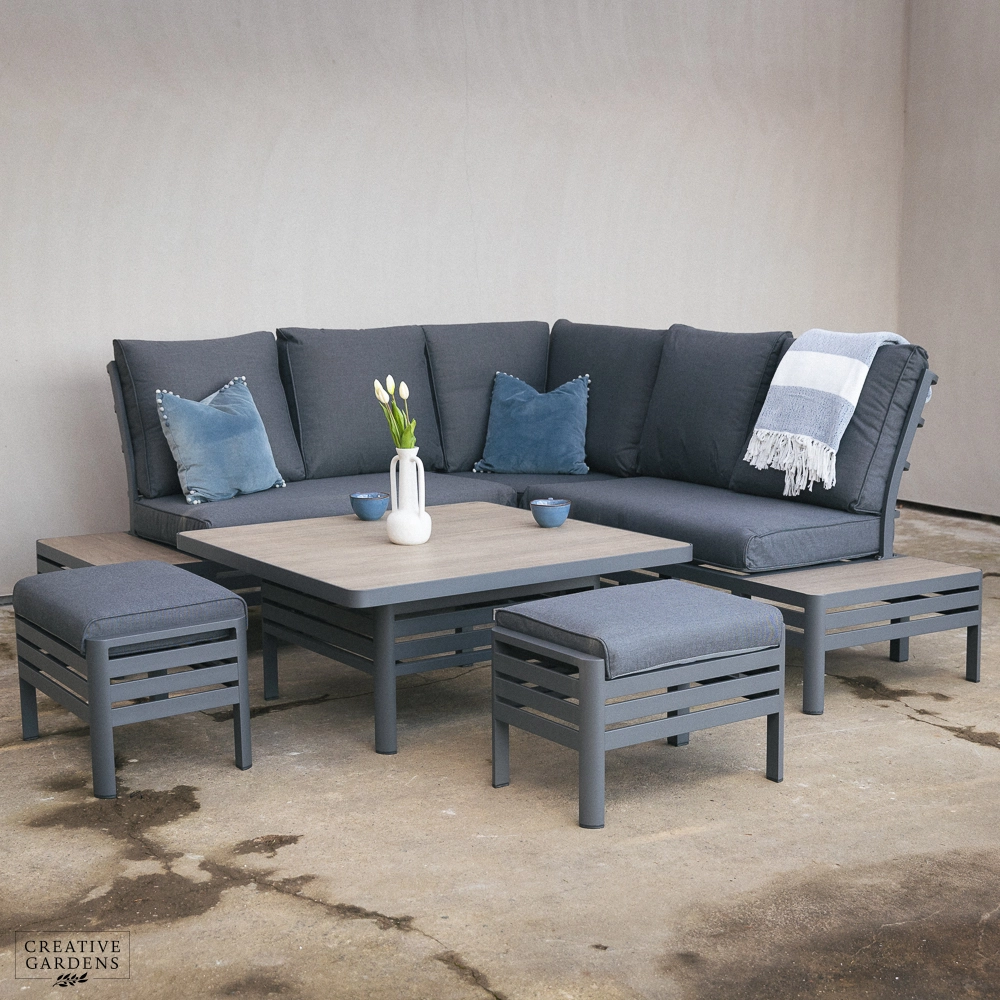 The set features a spacious corner sofa with handy wood effect side tables, along with 2 padded stools for additional seating. Matching this is the adjustable table, giving you the option to have it as a low-down coffee table, or higher up for more formal outdoor dining occasions. The table has a wood-effect ceramic glass top to complement the grey frame.