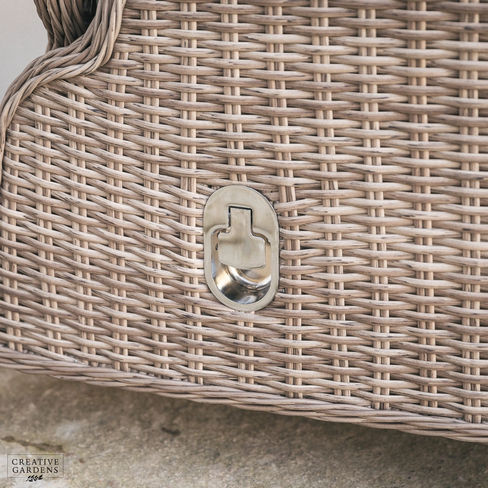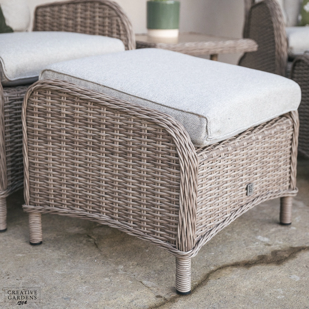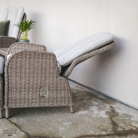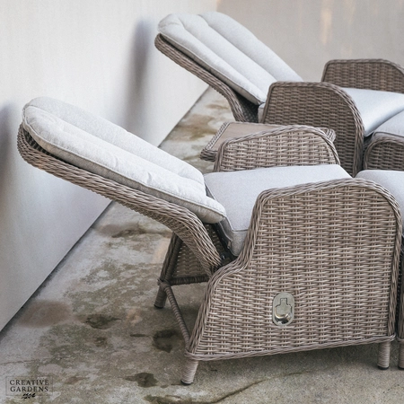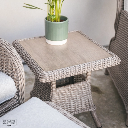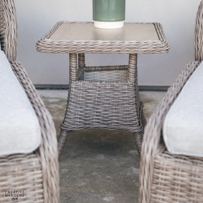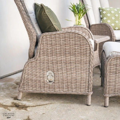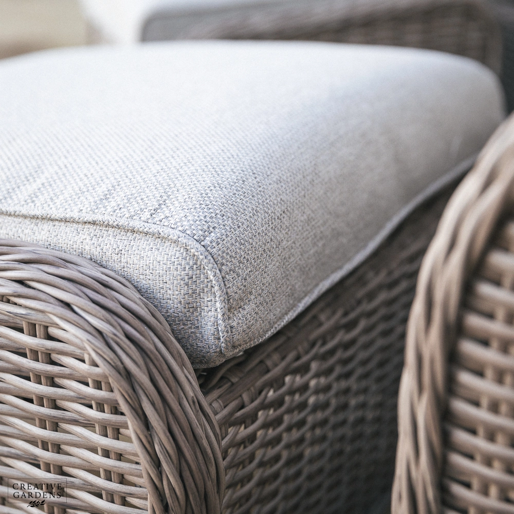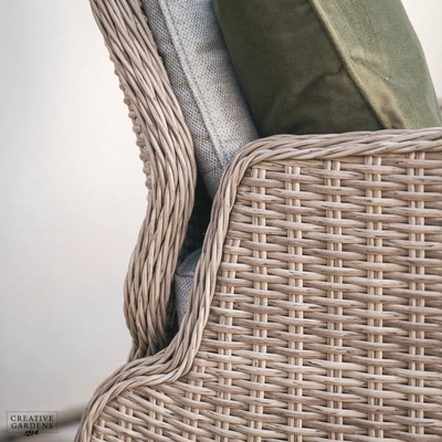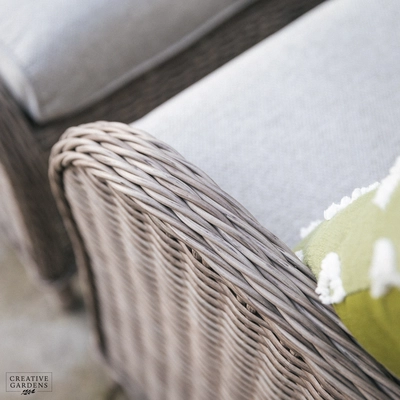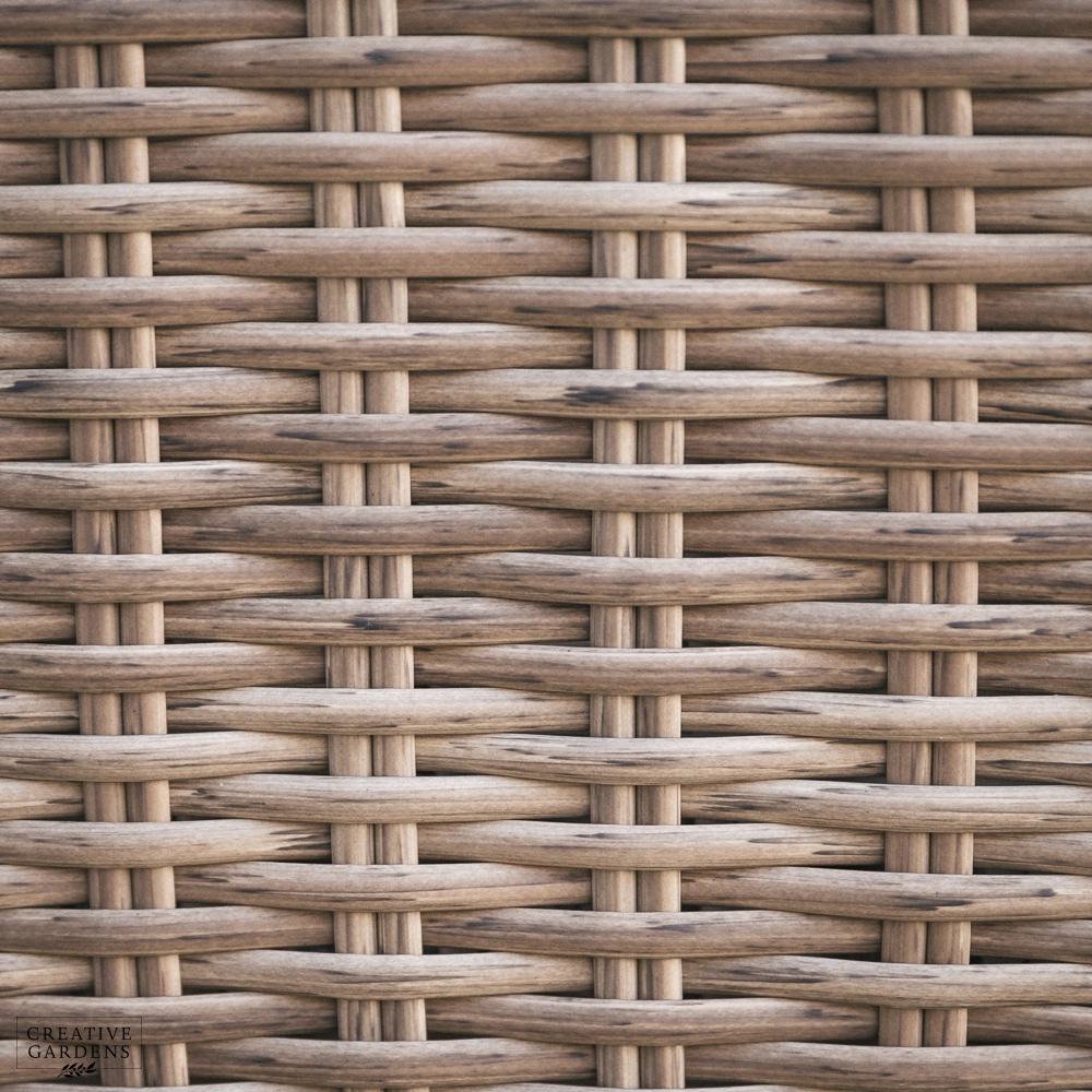 Multi-toned Everweave with braided detail: 100% waterproof, strong UV resistant and maintenance free; Seasonproof EDEN cushions which are water repellent, UV resistant and quick drying with Stainsafe Technology; Long lasting aluminium frame; Stackable roundback chairs for comfort and easy storage (dining chairs only), Removable Medium Grey coloured zip covers for easy cleaning; Ceramic wood-effect glass table tops