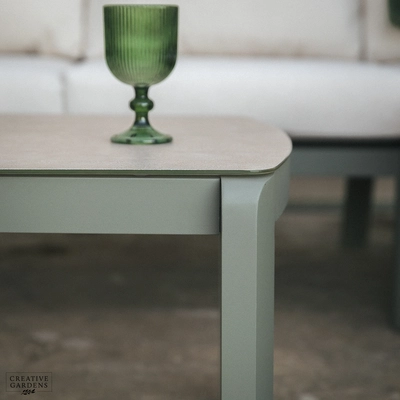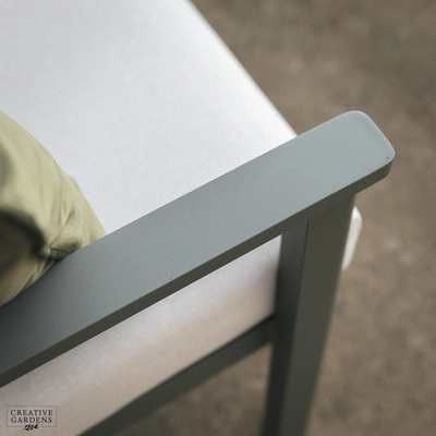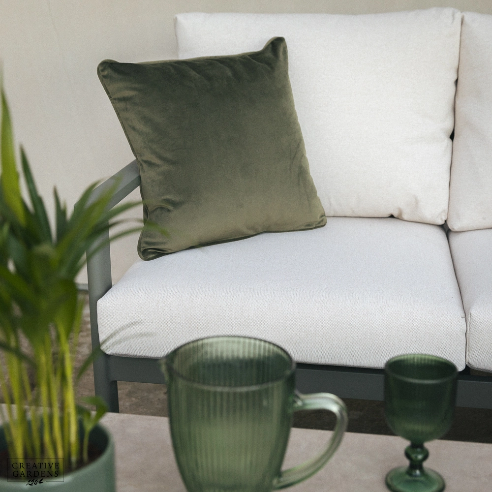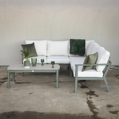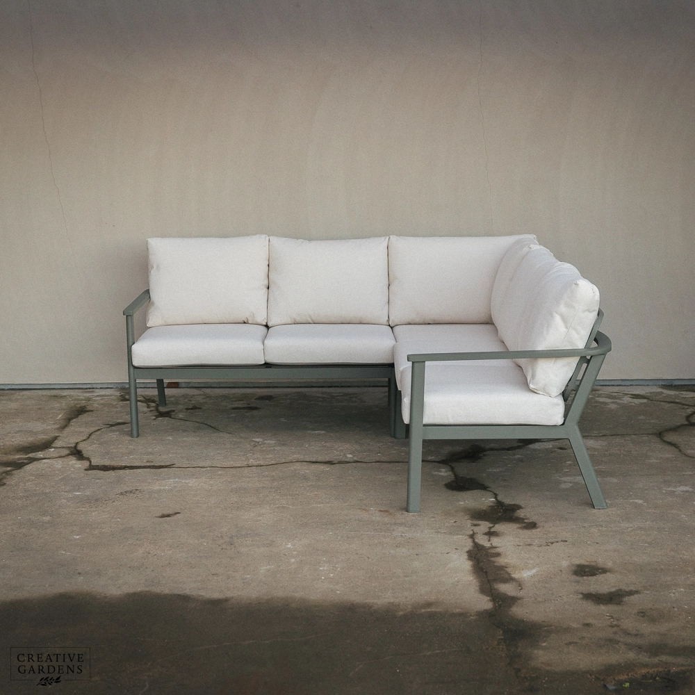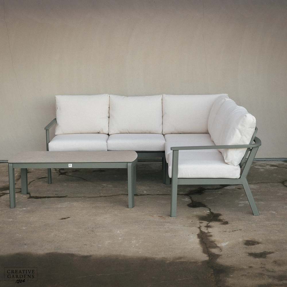 Transform your patio into a luxurious spot with the Leisuregrow Tuscany outdoor furniture collection. The rectangular compact modular lounge set, featuring a sleek, dark olive green aluminium frame, plush cream cushions, and a matching coffee table – perfect for stylish relaxation and entertaining. The cushions are crafted with Eden Seasonproof technology, ensuring they resist fading, water damage, and mildew, making this set ideal for any weather.