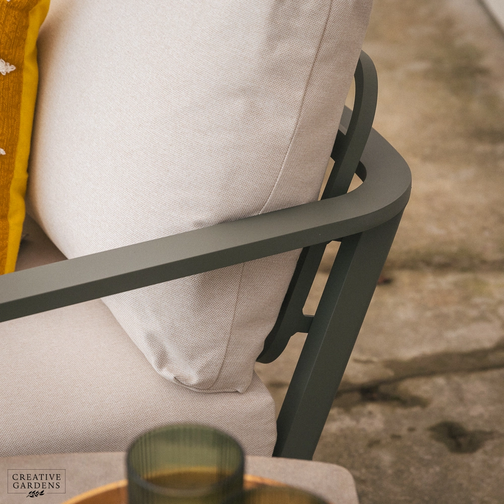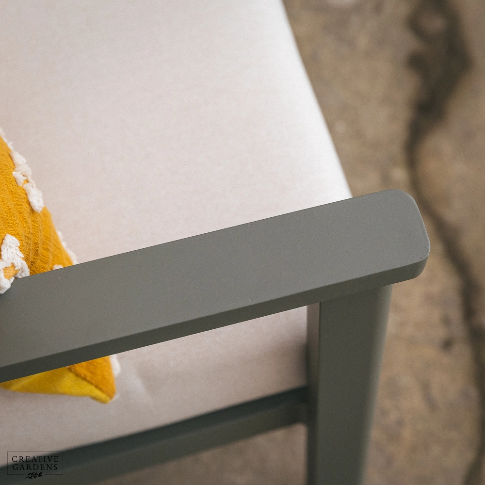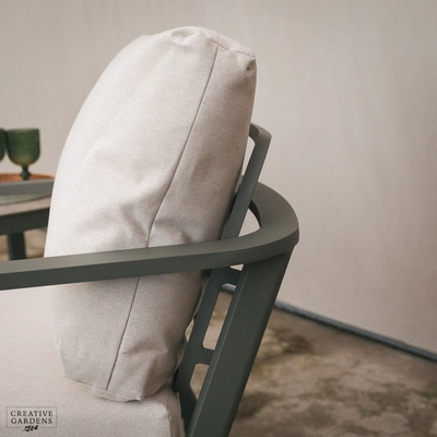 Create a stylish and relaxing outdoor retreat with the Tuscany Lounge Duo Set. Perfect for smaller spaces, this set includes two comfortable lounge chairs and a chic side table, all crafted from durable, rust-proof aluminum in a sophisticated sage green finish. The lightweight frames are complemented by plush, Eden Seasonproof cushions designed to withstand the elements throughout the summer months (though it's recommended to store them indoors during winter). The side table features a beautiful and practical stone-effect ceramic glass top, combining the elegance of natural stone with the durability and safety of tempered glass. The Tuscany Lounge Duo Set offers the perfect blend of style, comfort, and practicality for enjoying your outdoor space.