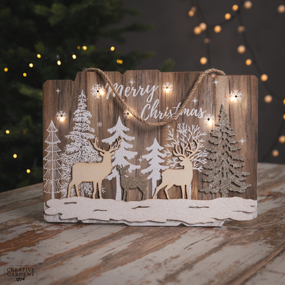 Wooden Hanging Plaque with Reindeer & Tree Scene with Warm White LED Lights