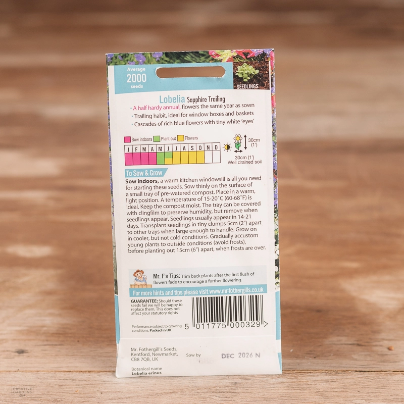 Are you looking for the product "Lobelia (Trailing) Sapphire"? We offer Fothergills Seeds products in our garden centers in Donaghadee, Bushmills, Galgorm and Logwood. You can also order the product "Lobelia (Trailing) Sapphire" online for £ 3.19 or check the products in Seeds & Bulbs. We look forward to seeing you soon!