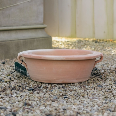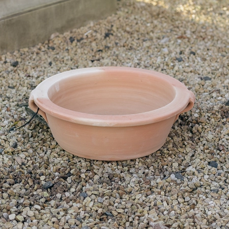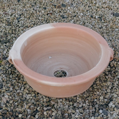 Traditional, Hand-made terracotta bowl with handles available in 2 sizes. This bowl includes a drainage hole at the bottom.