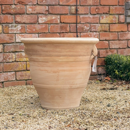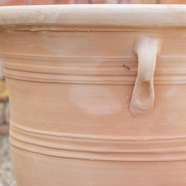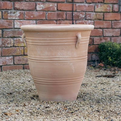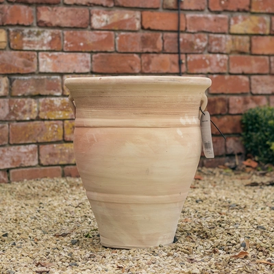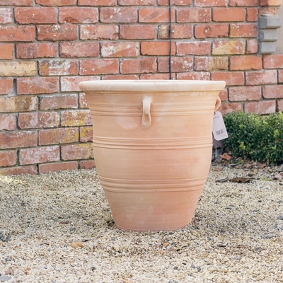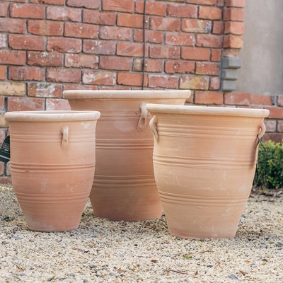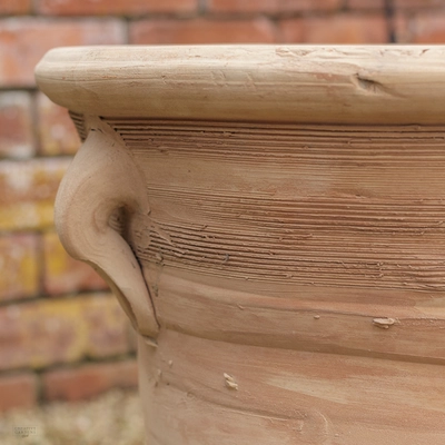 Traditional, Hand-made terracotta planter with handles available in 3 sizes. This planter comes in 3 assorted designs and all planters includes a drainage hole at the bottom.