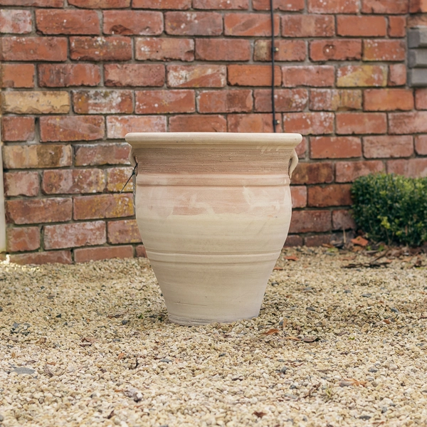Traditional, Hand-made terracotta planter with handles available in 3 sizes. This planter comes in 3 assorted designs and all planters includes a drainage hole at the bottom.